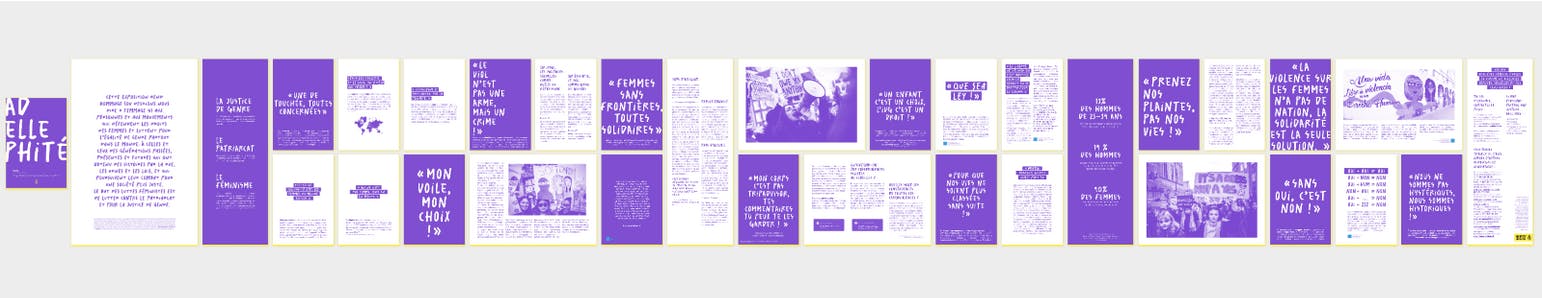 Nous avons choisi un papier fin, comme celui des affiches collées par les collectifs de femmes qui luttent, chaque jour et chaque nuit, pour leurs droits et qui transforment l’espace public en un lieu d’expression, où chaque message contribue à faire trembler les silences. Chaque panneau s’ouvre sur un slogan de manifestation scandé par celles qui descendent dans la rue pour que l’égalité soit une réalité.