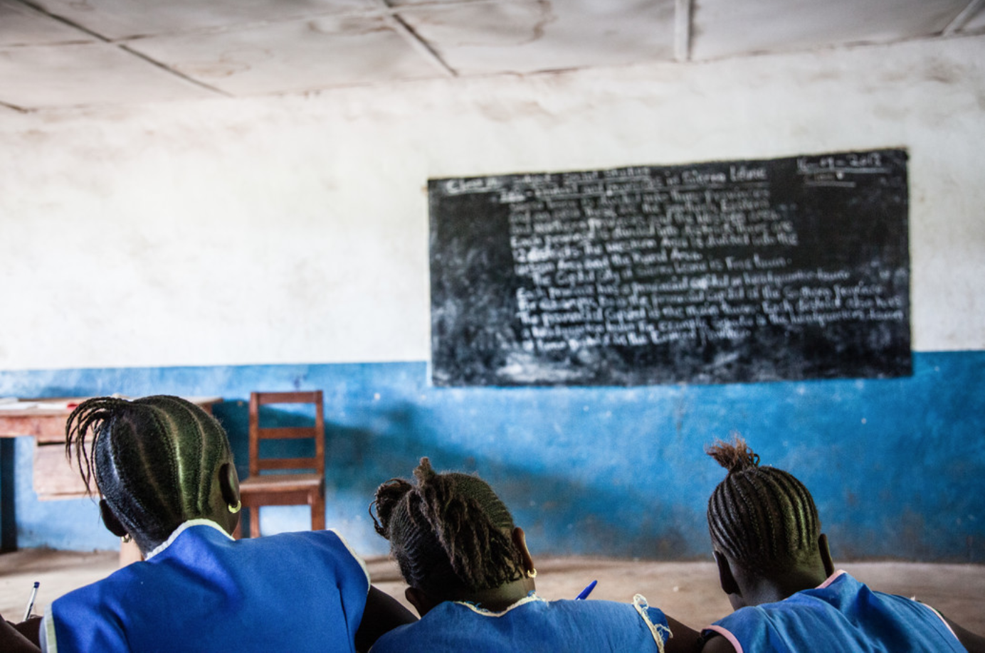Des écolières devant un tableau noir en Sierra Leone. Crédit : William Vest-Lillesoe / IBIS