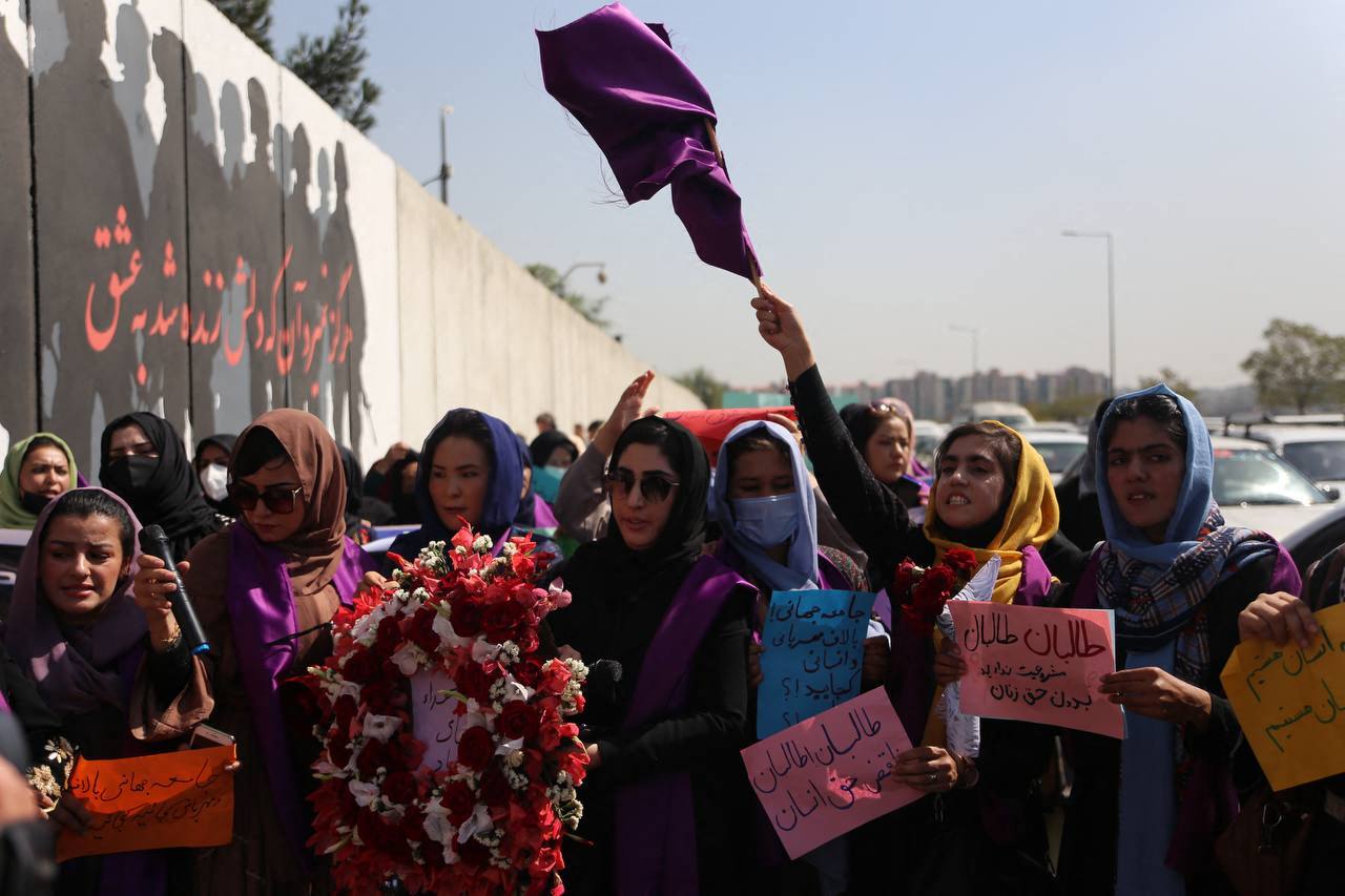 Un groupe de femmes marchent pour demander l’égalité des droits aux talibans, Kaboul, Afghanistan. Septembre 2021. © Bilal Guler / Anadolu Agency via AFP