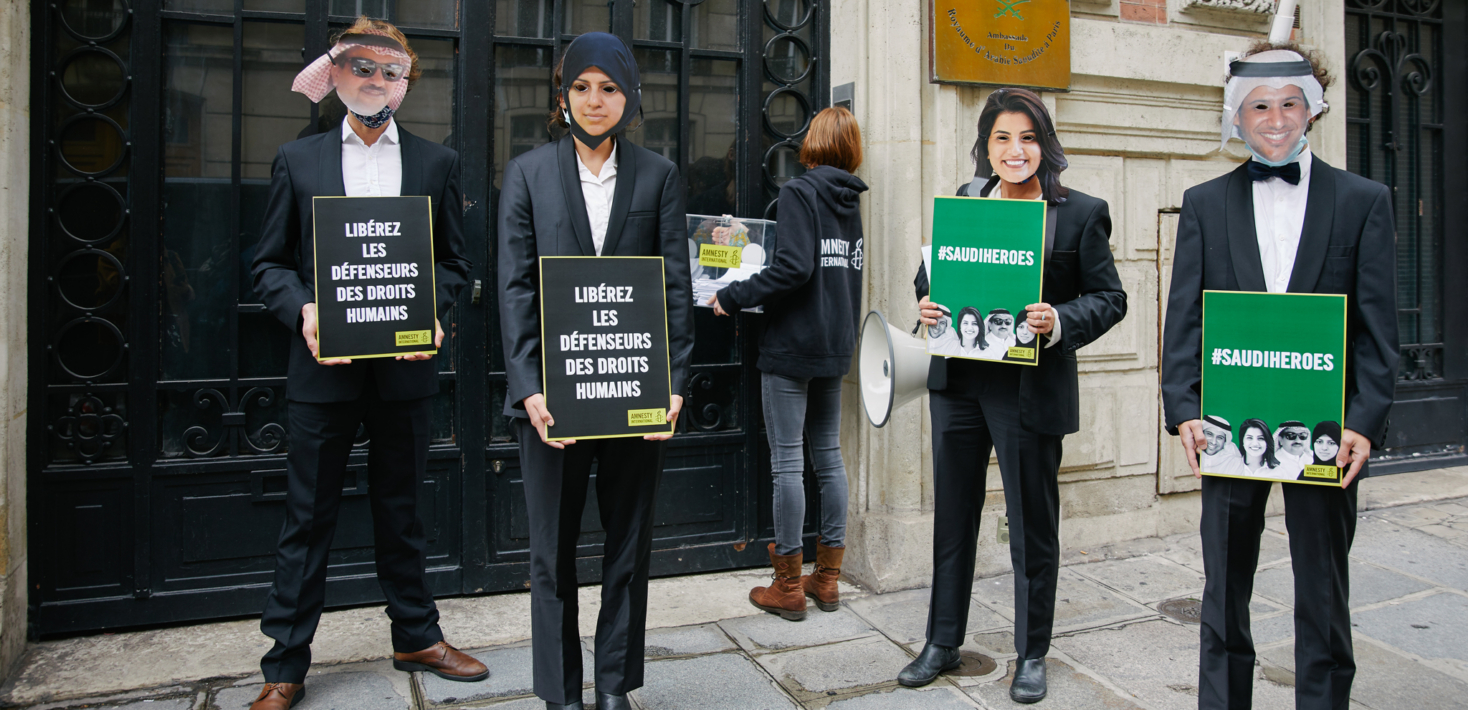 Depuis des années, les voix critiques sont harcelées et réprimées dans le pays. Mardi 6 octobre, nos militants se sont retrouvés devant l’ambassade de l’Arabie Saoudite à Paris pour dénoncer l’absence de voix critiques au Forum de la société civile du G20. Pour souligner leur absence, nous avons invité symboliquement à l’ambassade Loujain al-Hatloul, Nassima al-Sada, Mohammad al Otaibi et Waleed Abu al Khair, quatre éminents défenseurs des droits humains saoudiens actuellement emprisonnés.