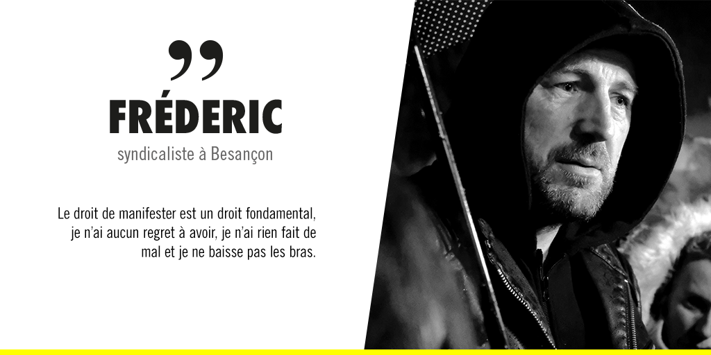 À Besançon, Frédéric, un syndicaliste de 48 ans, fait partie des Gilets Jaunes depuis le début du mouvement. Manifestant pacifique, Il a fait l’objet de dizaines d’heures de garde à vue, d’une perquisition et de poursuites. Il a aussi été condamné, à la suite d’une garde à vue de 24 h, simplement pour avoir scandé un slogan « Castaner assassin ! » qui visait à dénoncer les violences policières.