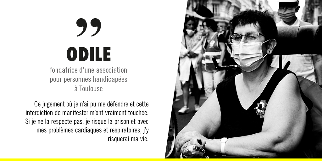 En revanche, Odile a été poursuivie pour outrage, entrave volontaire à l’arrivée des secours et violence avec arme (son fauteuil) à l’encontre de personnes dépositaires de l’autorité publique. Elle a été condamnée pour ce dernier chef d’accusation à deux mois de prison avec sursis et à plus de 2 000 € de dommages et intérêts. En outre, le tribunal de Toulouse a ajouté une peine complémentaire pour interdire à Odile de manifester pendant un an, dans tout le département de la Haute-Garonne.