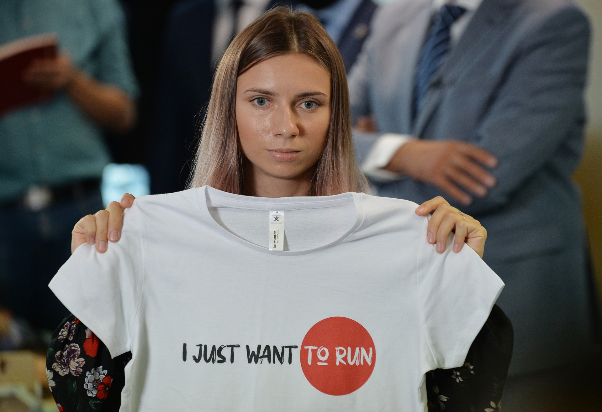L’athlète bélarusse Krystsina Tsimanouskaya porte un t-shirt « Je veux juste courir » lors d’une conférence de presse à son arrivée à Varsovie, en Pologne, après avoir échappé à un rapatriement au Bélarus, 5 août 2021 / © Alexei Pantsikov – TASS via Reuters.