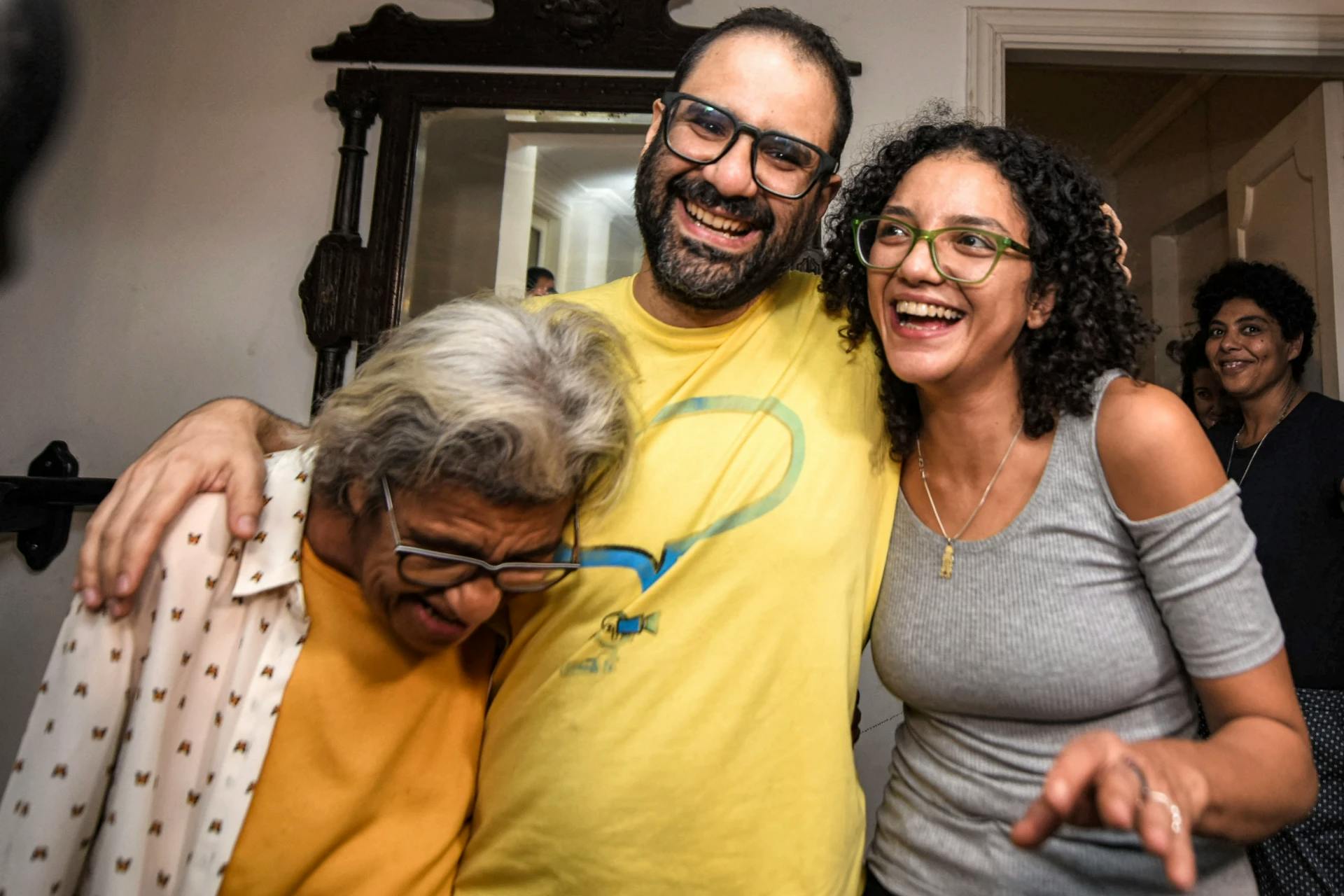 Alaa Abdel Fattah (au centre) embrasse sa mère, l'écrivaine Laila Soueif (à gauche), et sa sœur Sanaa Seif (à droite), chez lui après sa libération au Caire, le 23 septembre 2025. © Mohamed EL-RAAI / AFP