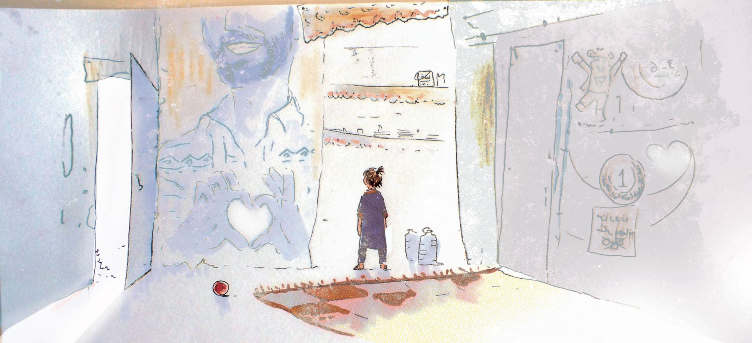 Sous la bâche d’une tente, la psychologue reçoit un enfant et lui montre un dessin pour l’aider à identifier ses émotions avant d’apprendre à les gérer.