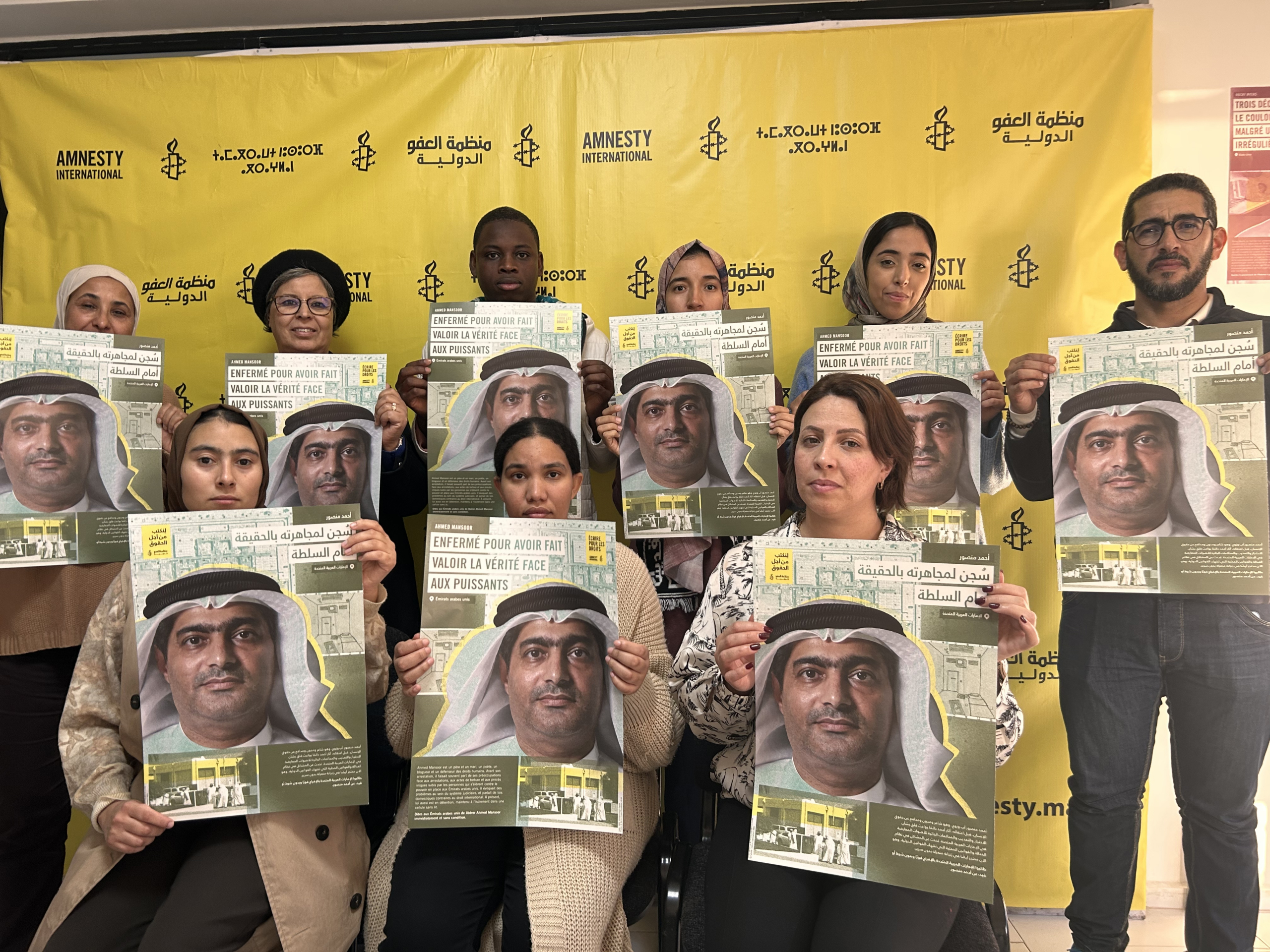 Mobilisation des militant.es d’Amnesty International en faveur d’Ahmed Mansoor au lancement de la campagne Changez leur histoire 2023 au bureau d’Amnesty International Maroc à Rabat le 25 novembre 2023.