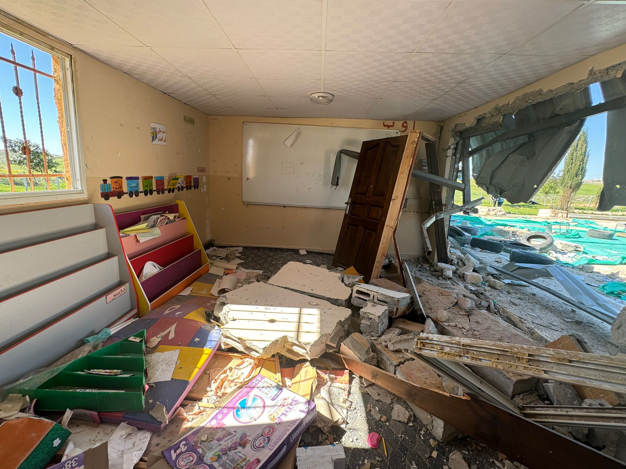 Vue de l’intérieur d’une école à Zanuta, démolie par des colons israéliens /