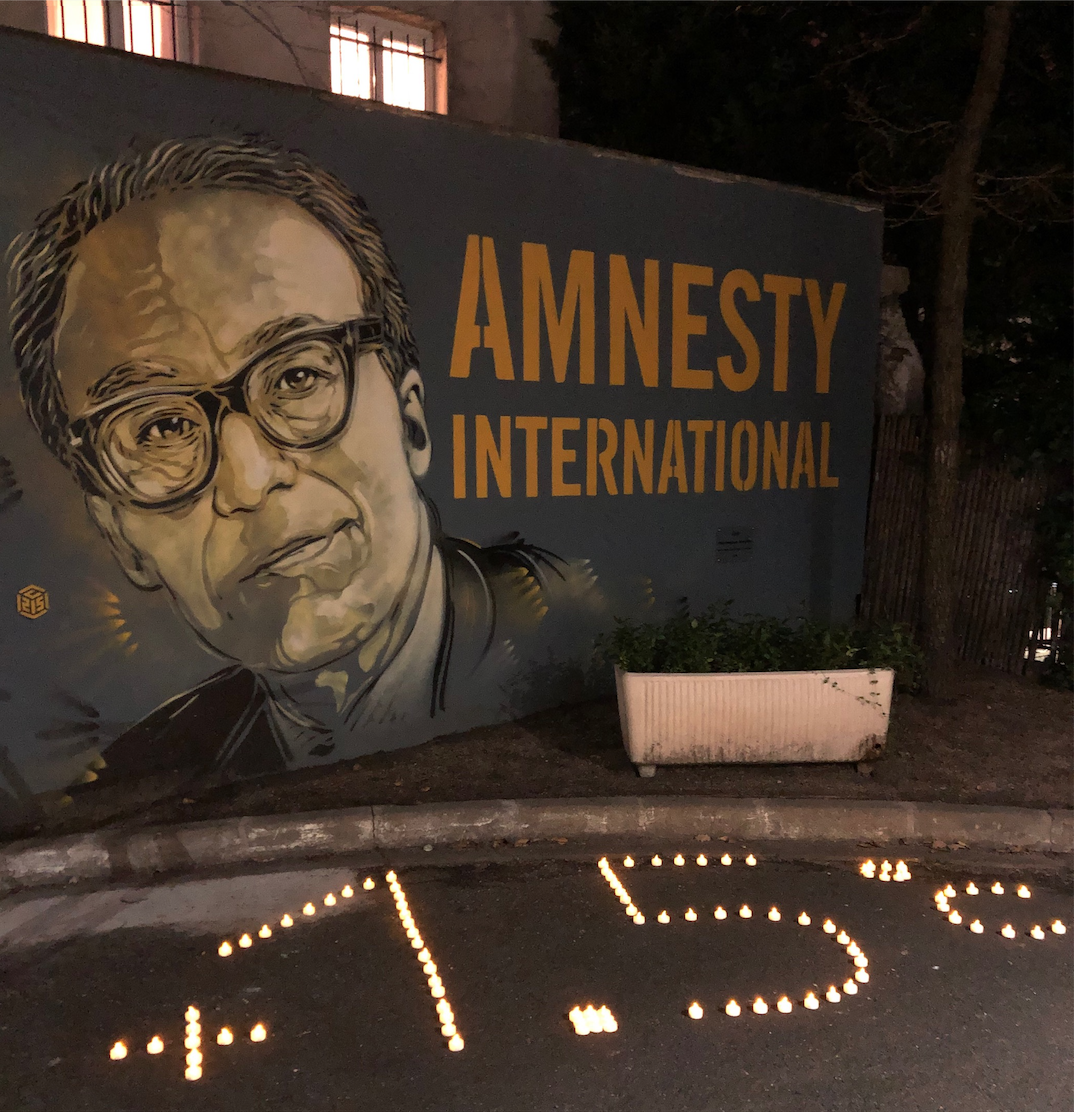 Photo de notre action lumineuse devant notre siège national, à Paris.