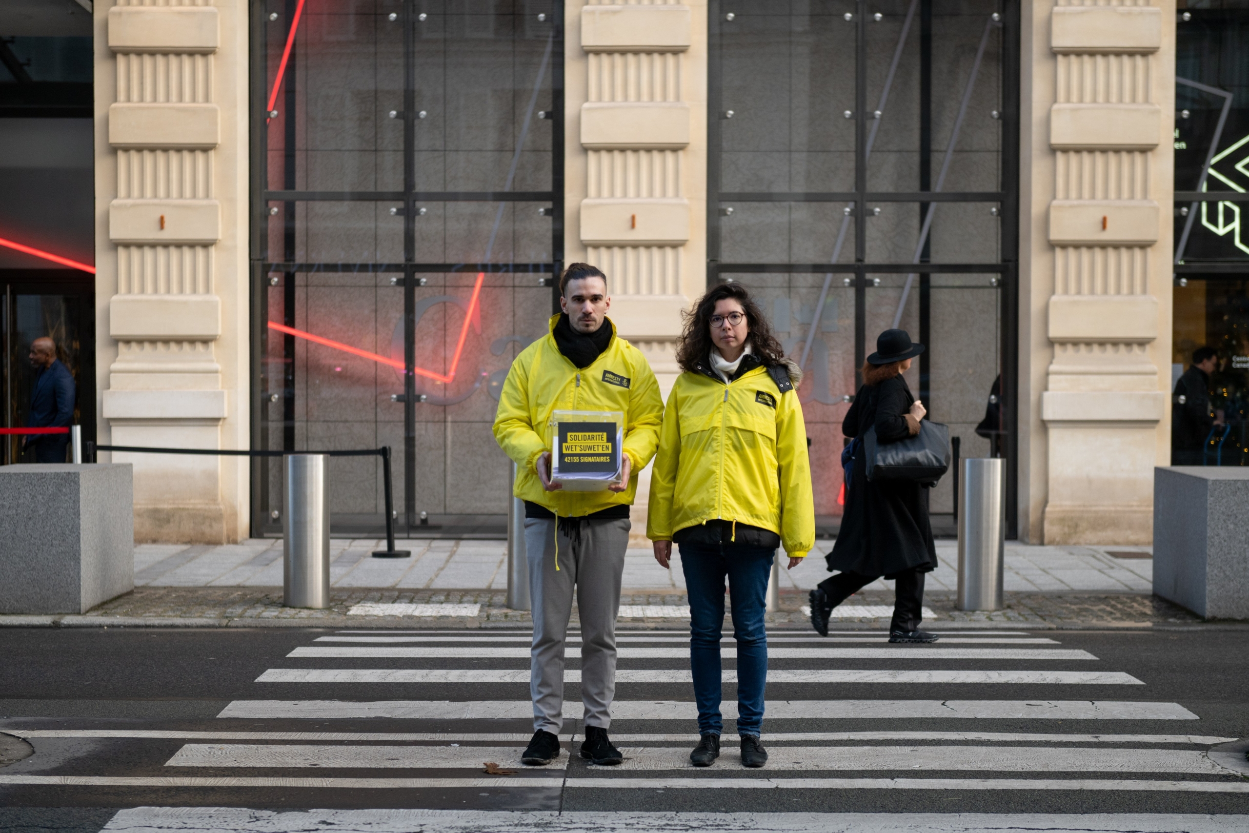 Après un temps fort de mobilisation devant l’Ambassade du Canada, Gregory Bianchi Perla, chargé de campagne sur les questions de justice climatique chez Amnesty International France (à gauche) et Morgane Joffredo, membre de la commission Justice Climatique chez Amnesty International France (à droite) ont été reçu·e·s par les autorités canadiennes dans l’Ambassade du Canada en France. Gregory Bianchi Perla et Morgane Joffredo ont pu exposer les recommandations de notre rapport, appuyées par les 50 000 signatures de nos militant·es en soutien à la nation autochtone Wet’suwet’en. Les autorités canadiennes nous ont annoncé qu’elles feraient remontrer nos préoccupations aux autorités compétentes. En attendant, il est essentiel de ne pas relâcher la pression et de continuer à soutenir la nation autochtone des Wet’suwet’en. La première chose à faire : signer notre pétition.