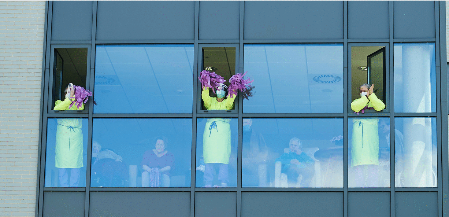 Des travailleuses de la santé portent des équipements de protection et applaudissent devant le foyer pour personnes âgées de San Candido, le 17 avril 2020, à Santander, en Espagne. Crédit : Juan Manuel Serrano Arce / Getty Images