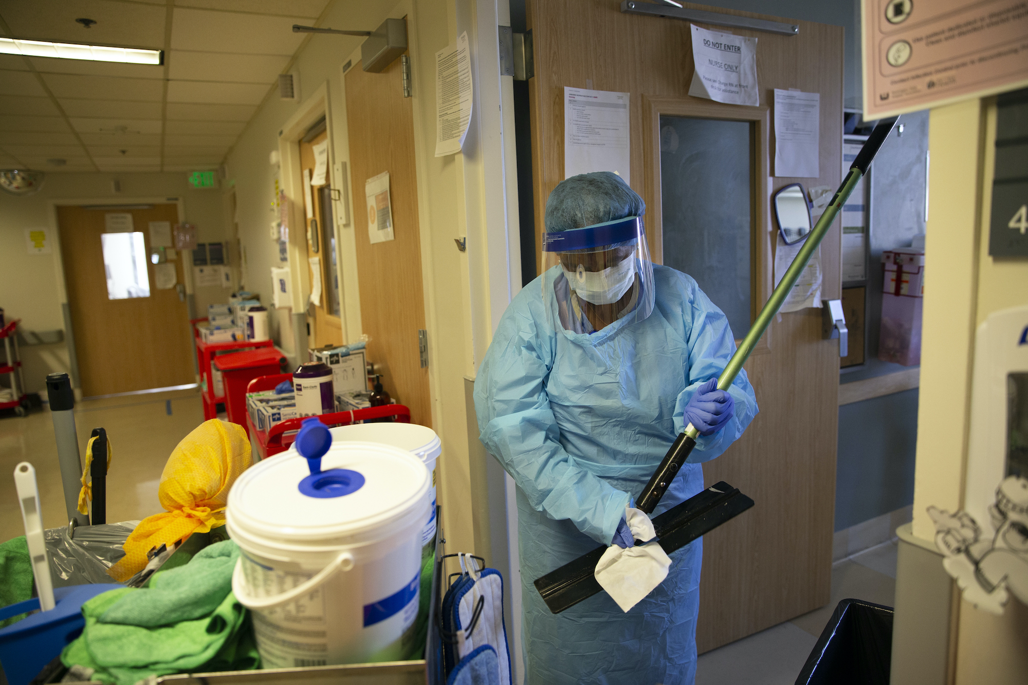 Aster Mekonen nettoie et désinfecte une chambre dans l’unité de Covid-19 du centre médical de Harborview, le 7 mai 2020 à Seattle, Washington. Crédit : Karen Ducey / Getty Images.