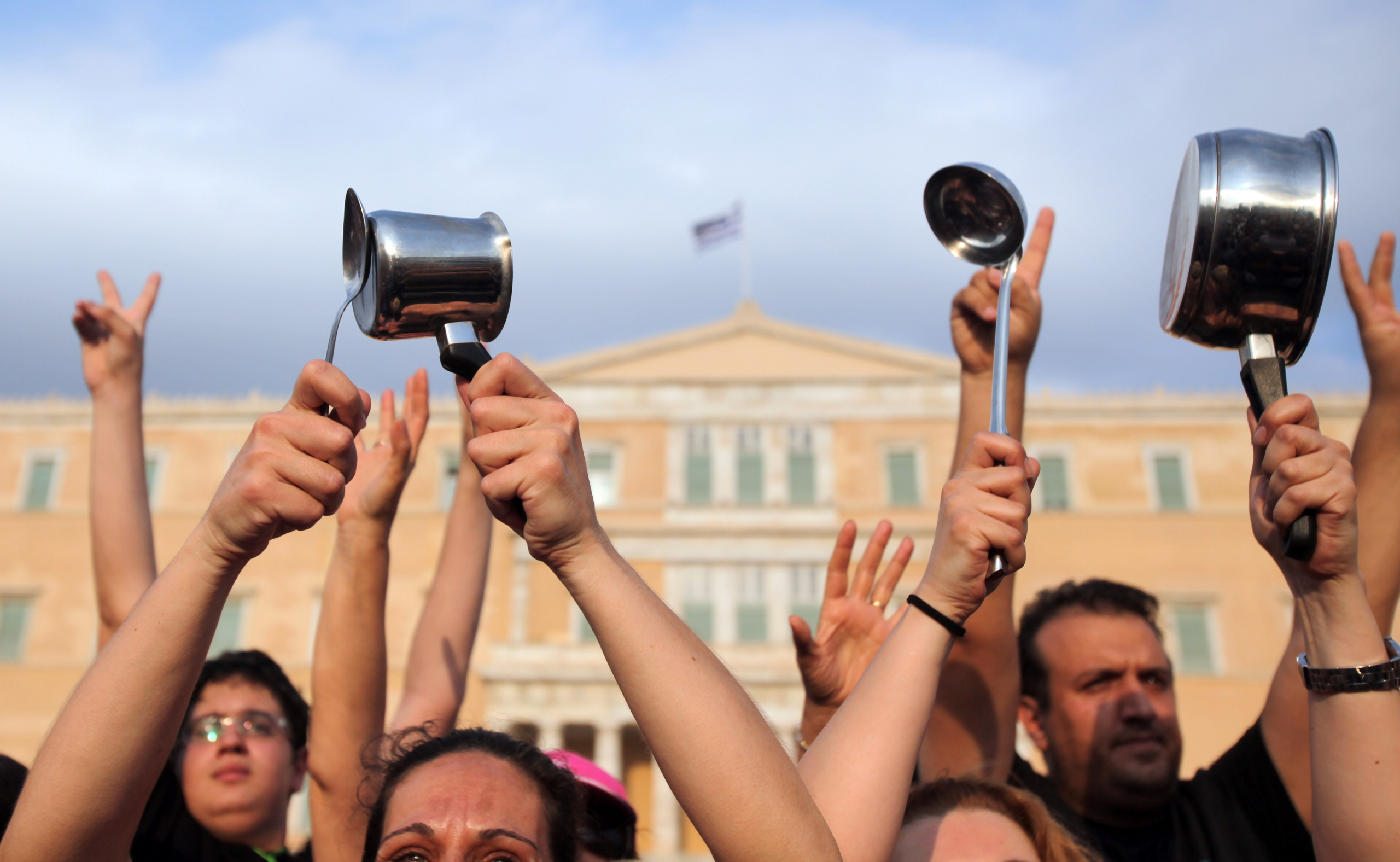 À Athènes, en Grèce, le 29 mai 2011, des manifestants tapent sur des casseroles lors d’un rassemblement sur la place Syntagma, devant le Parlement grec, contre les nouvelles mesures d’austérité. Crédit : Matt Cardy / Getty Images
