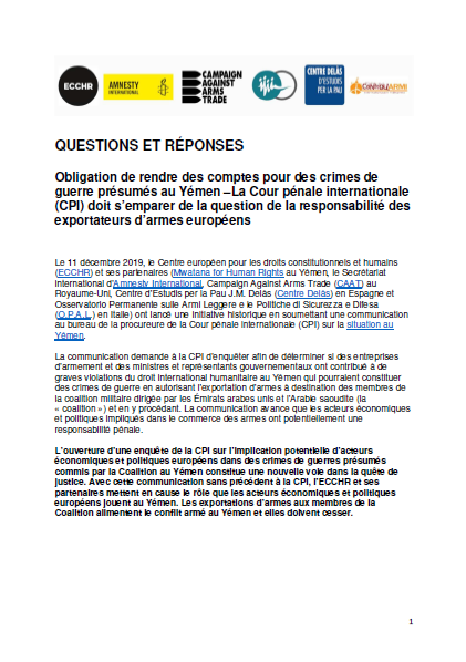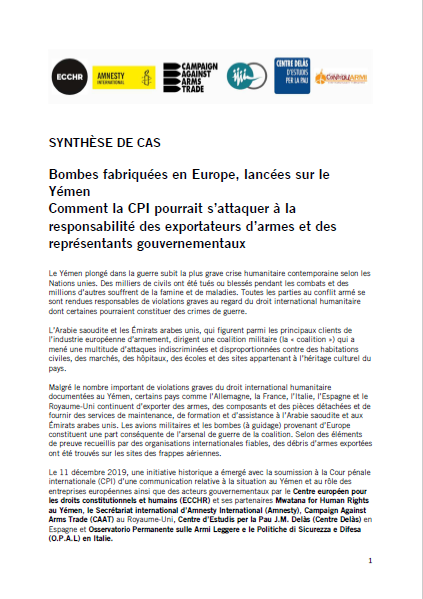 Nous demandons à la procureure de la Cour pénale internationale (CPI) d’enquêter sur le rôle qu’ont pu jouer des dirigeants d’entreprises européennes de l’industrie de l’armement et des autorités en charge de délivrer les autorisations, dans des violations du droit international humanitaire commises au Yémen qui pourraient constituer des crimes de guerre. Nous nous joignons au Centre européen pour les droits constitutionnels et humains (ECCHR) pour faire officiellement cette demande à la CPI.