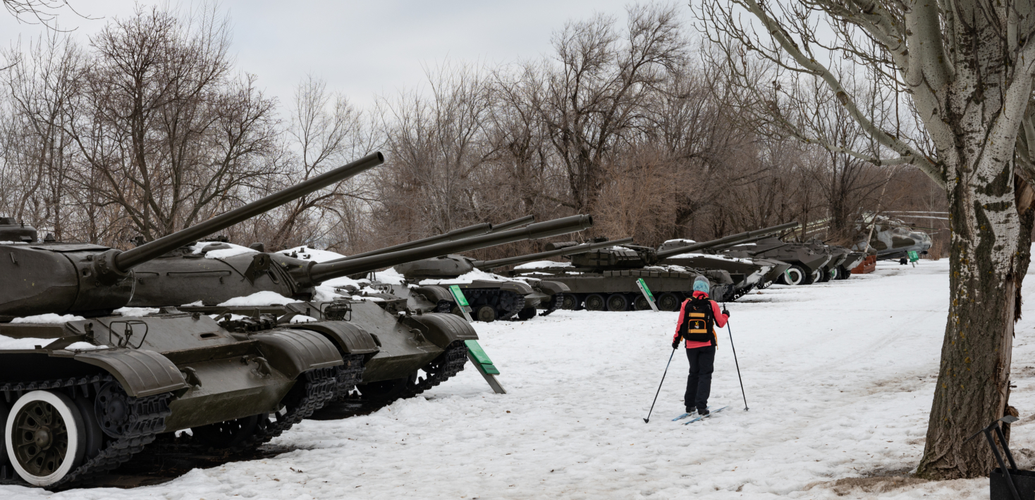 Cette photo d’un photographe russe anonyme resté en Russie montre comment la vie des gens ordinaires a été bouleversée par la militarisation. On observe un paysage de la vie normale mais où la personne doit skier entre les chars russes, comme un rappel de la guerre en cours qui plane au-dessus du quotidien. La militarisation est partout aujourd’hui en Russie et elle est l’un des moyens de contrôle de Poutine envers la population.