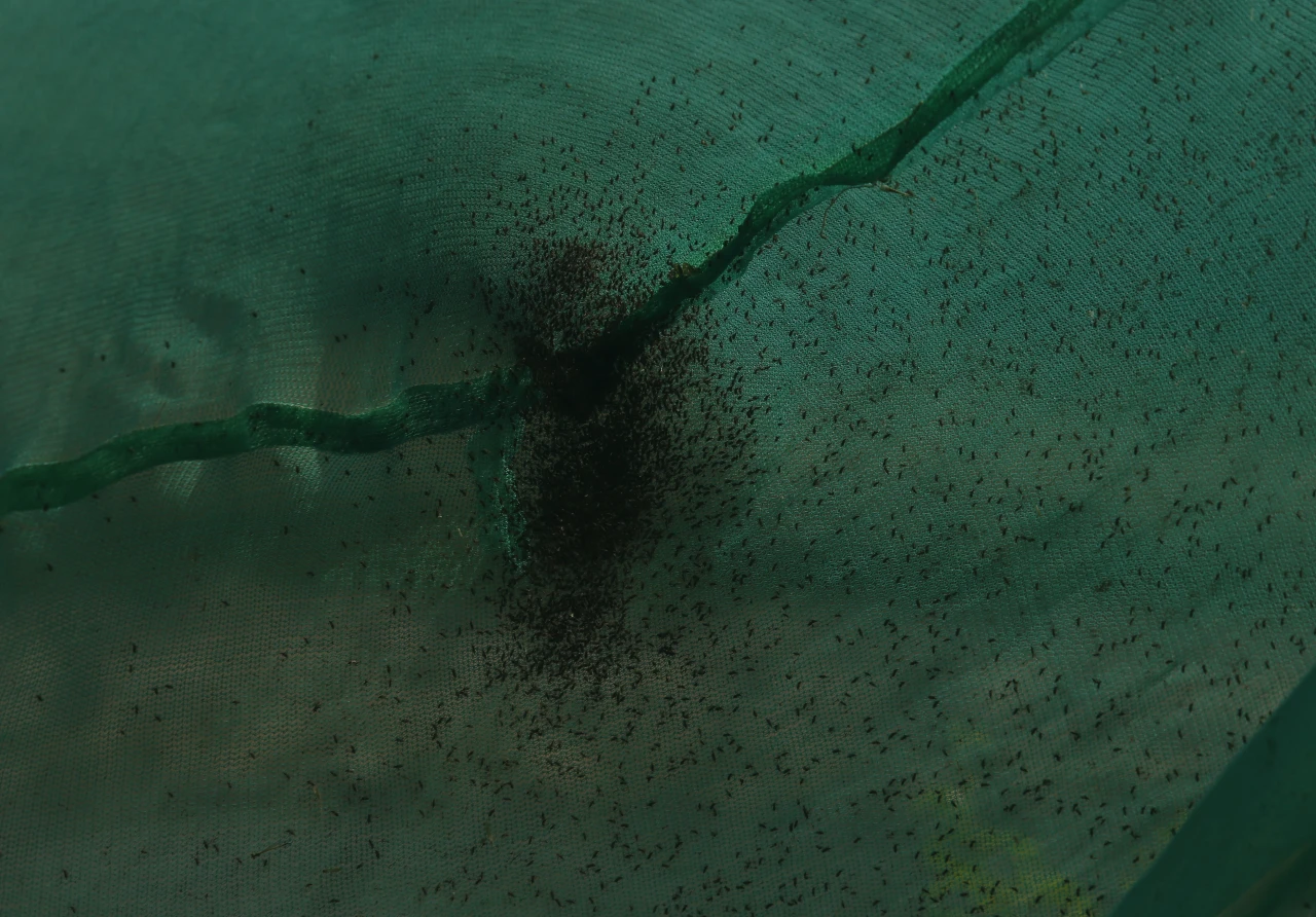 Un essaim de moustiques agglutiné à l’extérieur d’une tente qui abrite des personnes déplacées par les inondations.