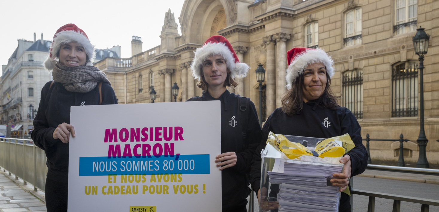 Mercredi 18 décembre 2019, nous remettons au Président Macron 80 000 signatures. Autant de voix qui lui demandent d’agir concrètement pour que cessent les attaques croissantes contre les défenseurs des droits humains, en France et partout dans le monde.