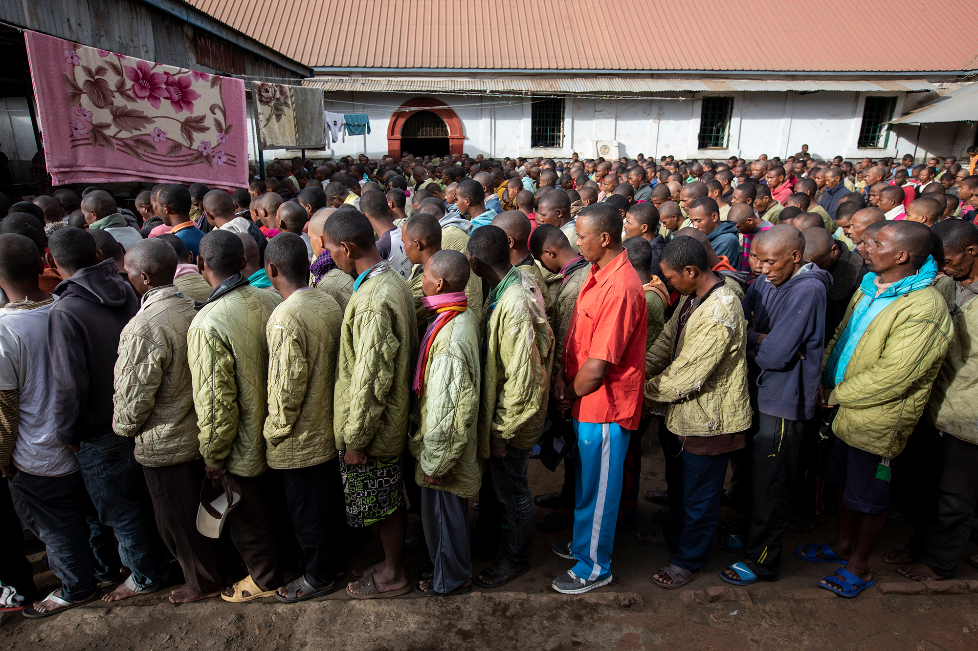 Des prisonniers font la file pour l’appel du matin à la prison d’Antsirabe, Madagascar © Richard Burton / Amnesty International