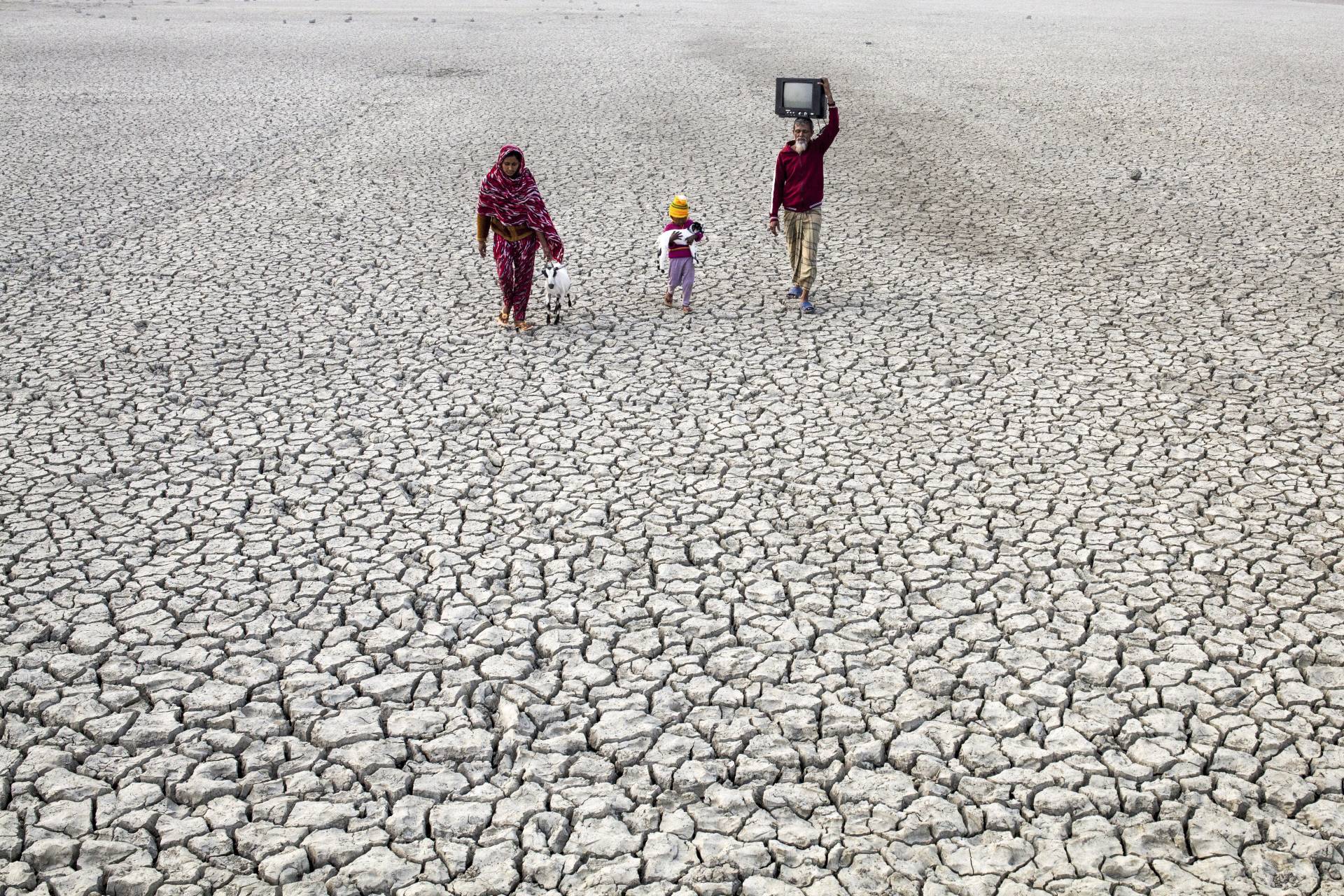Une famille au Bangladesh marche sur un champ de fissures profondes alors que l’élévation du niveau de la mer provoque des fissures en laissant du sel sur le sol après évaporation, à Satkhira, le 20 janvier 2016 / © Zakir Hossain via AFP