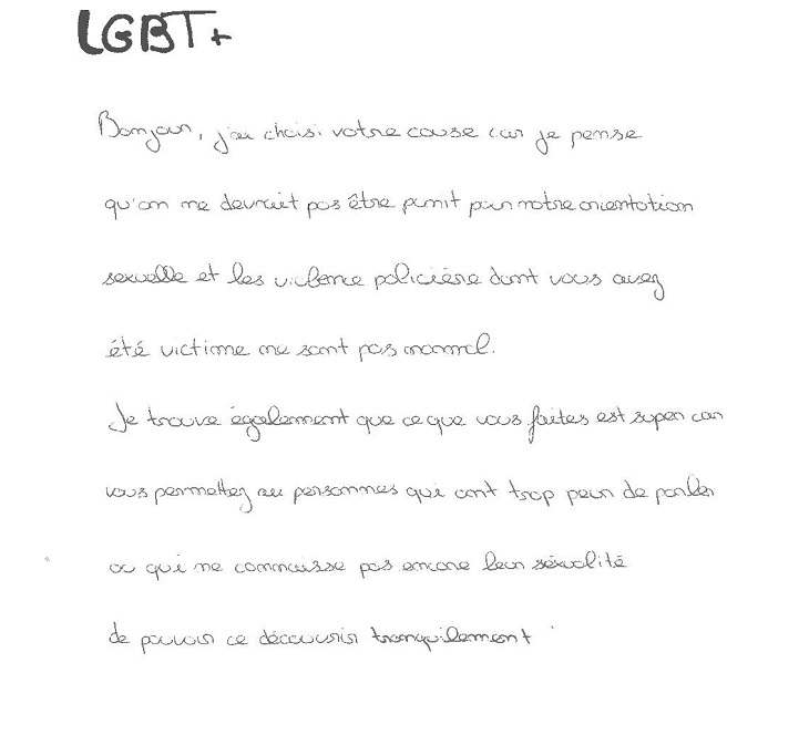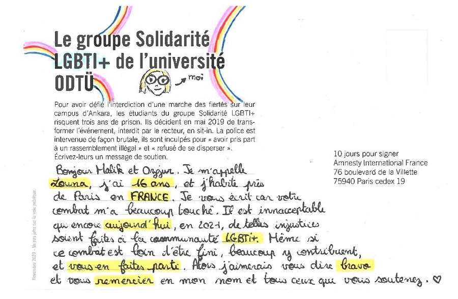 A la fin du mois de mars, les élèves en provenance des lycées de Noisiel et de Lognes nous ont fait parvenir une grosse enveloppe pour chacune des personnes défendues dans le cadre des 10 Jours Pour Signer de 2020. Nous avons été impressionnés par le contenu personnalisé et spontané de chaque enveloppe. Merci à eux !