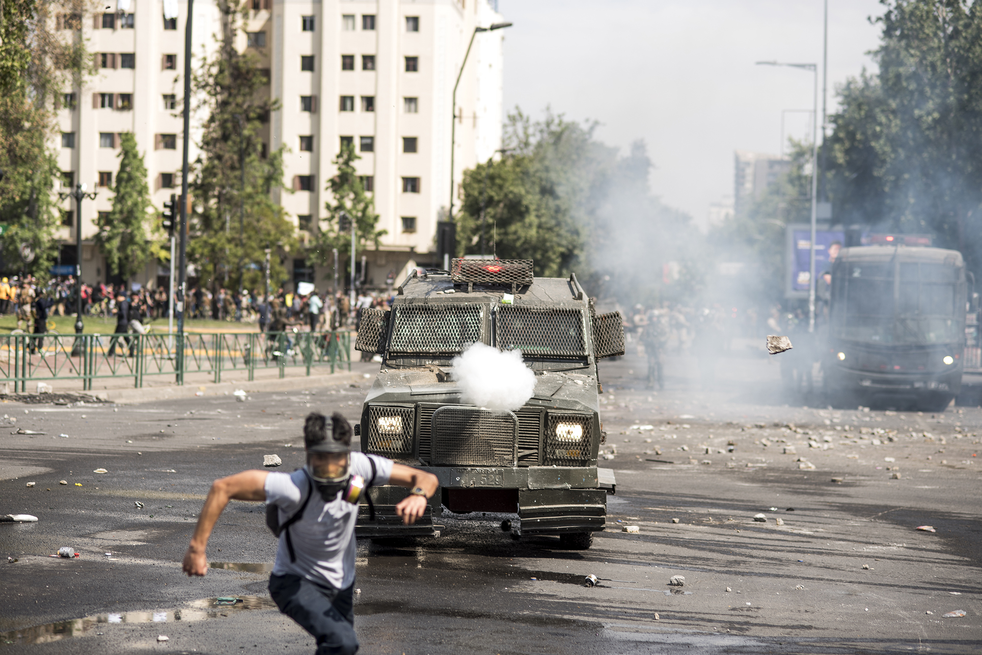 Un manifestant court après un tir, à Santiago, sur la place d’Italie, renommée place de la Dignité par les manifestants /