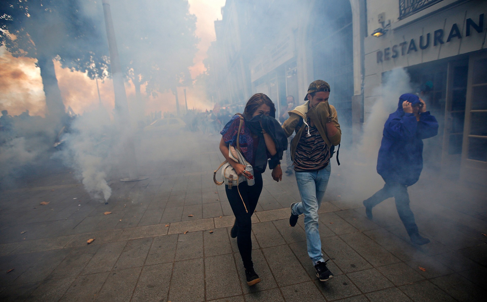 Des manifestants fuient les gaz lacrymogènes lors d’une manifestation à Nantes, France, 2016 /