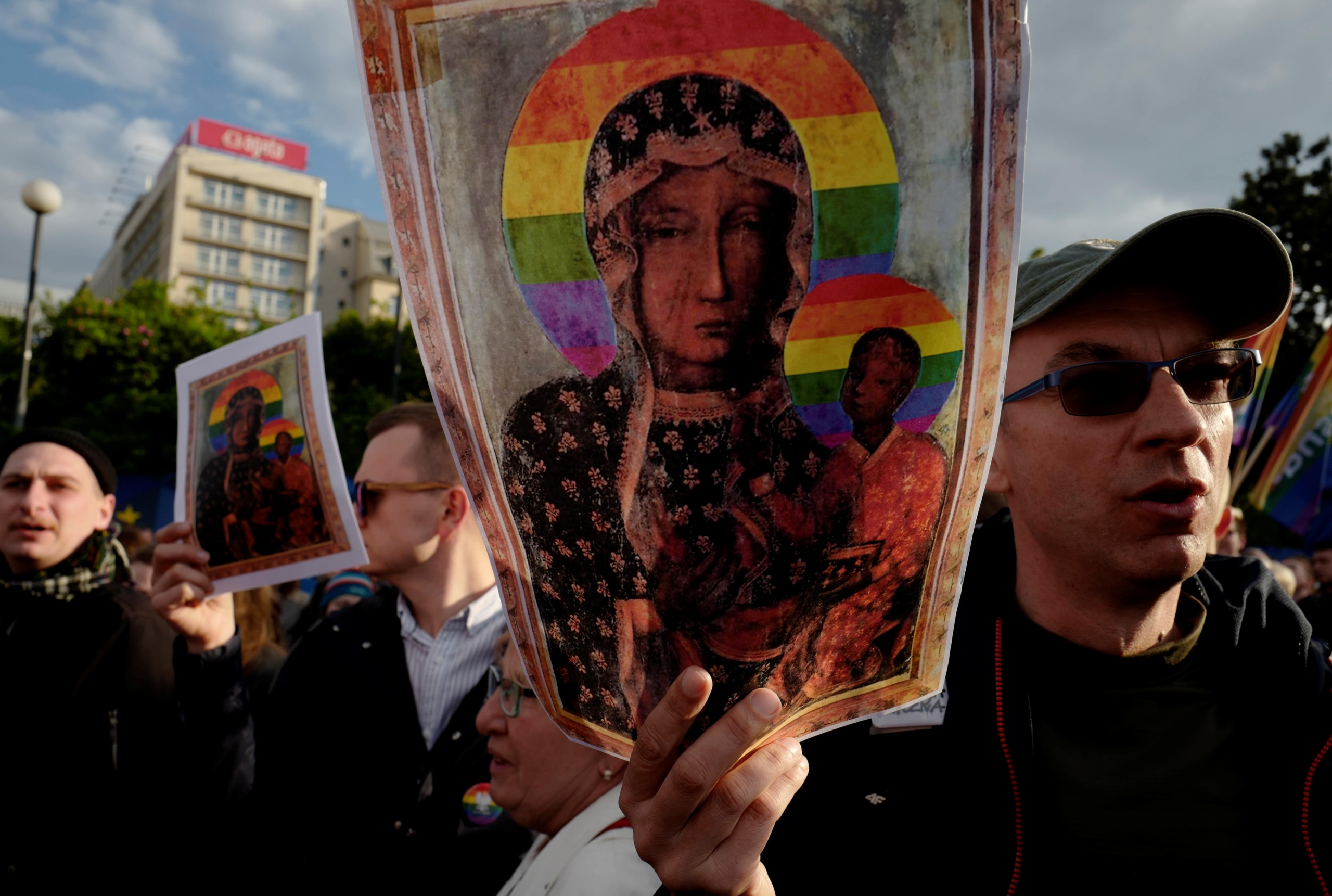 Un manifestant tient une affiche de la Vierge Marie noire de Czestochowa – vénérée par les chrétiens catholiques et orthodoxes – auréolée des couleurs du drapeau LGBTI+, en signe de soutien avec Elżbieta, Anna et Joanna, Varsovie, mai 2019. © REUTERS/Kacper Pempel