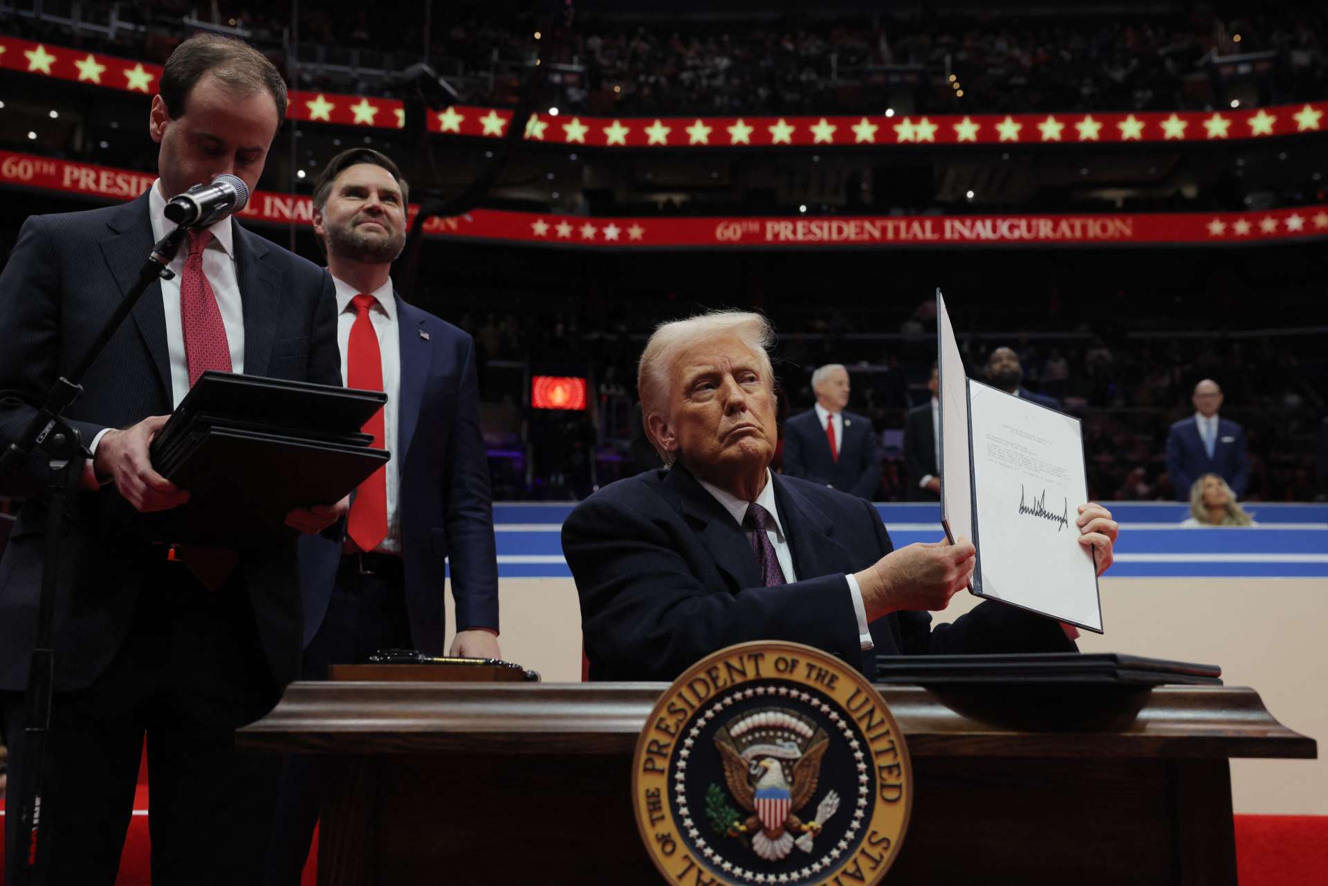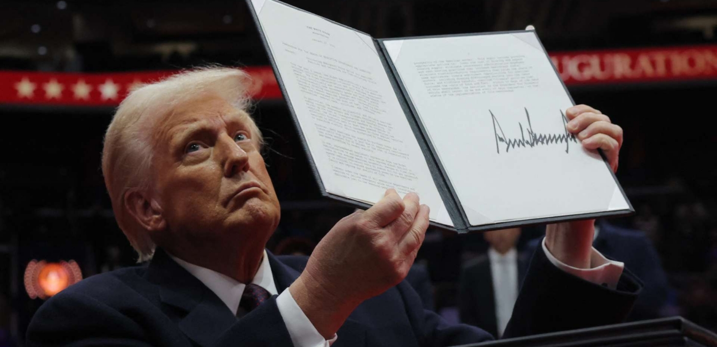 Donald Trump présente sa signature sur l’un des décrets qu’il a signé, à l’intérieur de la Capital One Arena, le 20 janvier 2025 /
