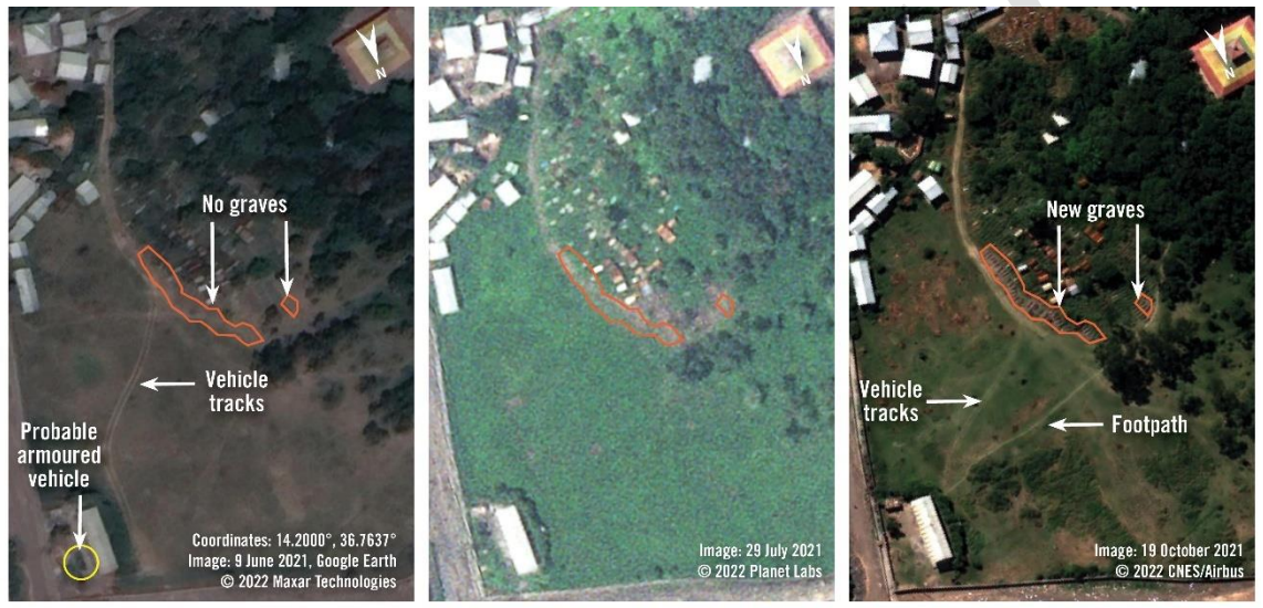 Au-delà des témoignages glaçants que nous avons recueillis, nos équipes ont analysé des images satellite qui montrent clairement l’apparition de nouveaux sites d’inhumation sur les terres des églises Saint-George et Saint-Michael. Précisément là où les habitants ont déclaré avoir enterré les victimes.