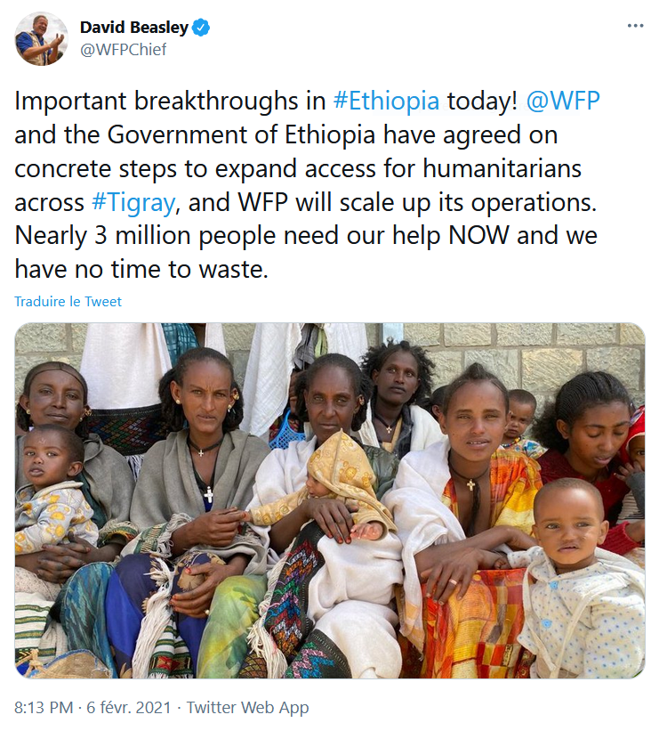 Le 6 février dernier, David Beasley, directeur exécutif du Programme Alimentaire Mondial de l’Onu a annoncé un accord avec le gouvernement éthiopien concernant des mesures concrètes afin d’élargir l’accès des humanitaires à la région tigréenne. Les modalités de cet accord sont encore loin d’être suffisantes face à la gravité de la situation. L’aide aux populations du Tigré continue encore d’arriver au compte-goutte.