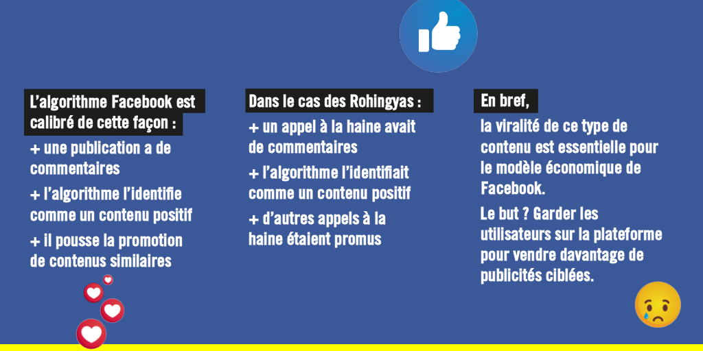 Si ce post Facebook a été aussi viral, au point de déclencher des émeutes, c’est parce que le système algorithmique l’a identifié comme « positif » au vu du nombre de commentaires et de partage. Cet exemple montre ce à quoi ont été confrontés les Rohingyas. Les messages de haine en ligne contre cette communauté ont contribué à normaliser les violences et à les encourager, dans le monde réel.