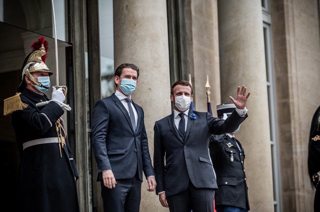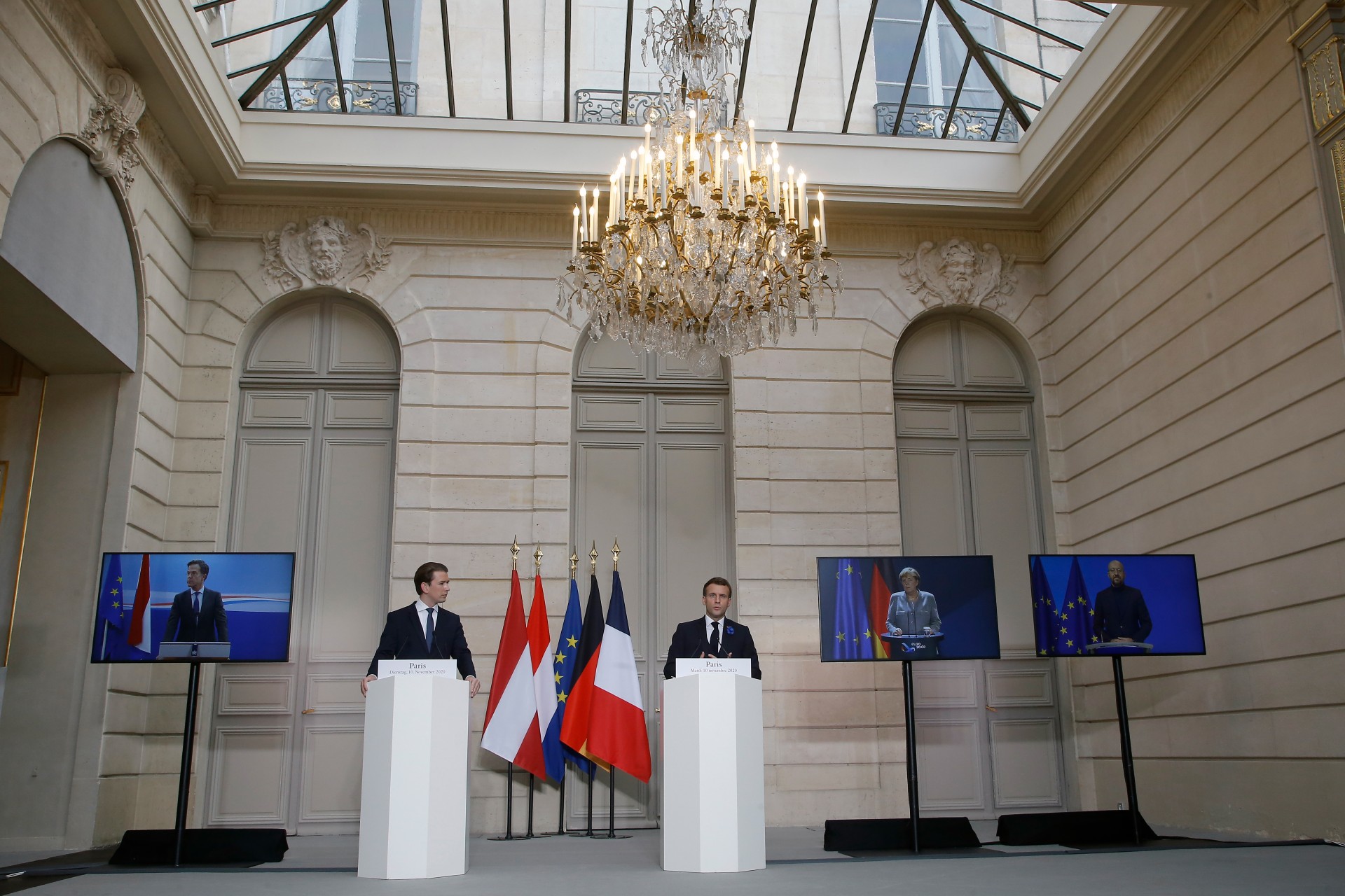 Le président français Emmanuel Macron et le chancelier autrichien Sebastian Kurz assistent à un sommet vidéo européen pour trouver des réponses européennes au terrorisme, le 10 novembre 2020, Palais de l’Élysée, ©Michel Euler / POOL / AFP