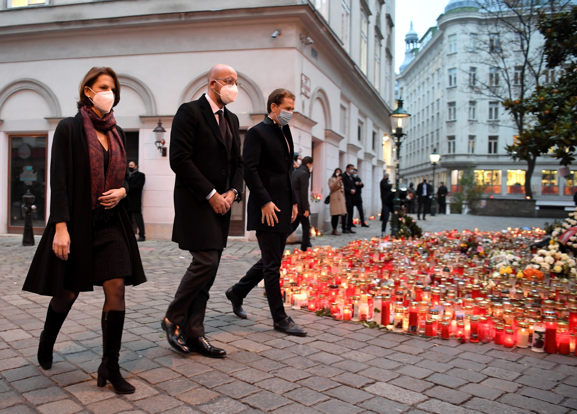 La ministre autrichienne des affaires européennes Karoline Edtstadler, le président du Conseil européen Charles Michel et le chancelier autrichien Sebastian Kurz viennent rendre hommage aux victimes de l’attaque terroriste à Vienne, le 9 novembre 2020, ©Roland SCHLAGER / APA / AFP