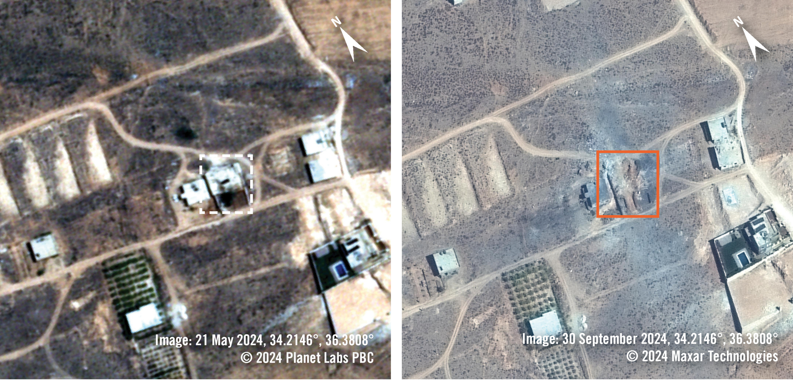 Les images satellite du 21 mai 2024 montrent la maison de la famille al Shaar, dans le village d’al Ain, dans la Békaa, au Liban. Le 30 septembre, le bâtiment est complètement détruit et on voit sur le sol des traces d’incendie dues à l’explosion. Des traces de déblaiement sont visibles dans la zone des débris, ce qui concorde avec les vidéos montrant la présence de pelleteuses après la frappe.