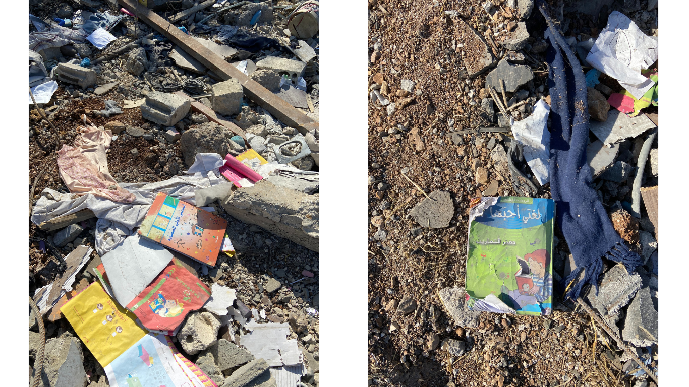 Nos chercheurs se sont rendus sur les lieux des frappes à Aitou et ont trouvé des livres pour enfants, des jouets, des vêtements et des ustensiles de cuisine dans les décombres de la maison.