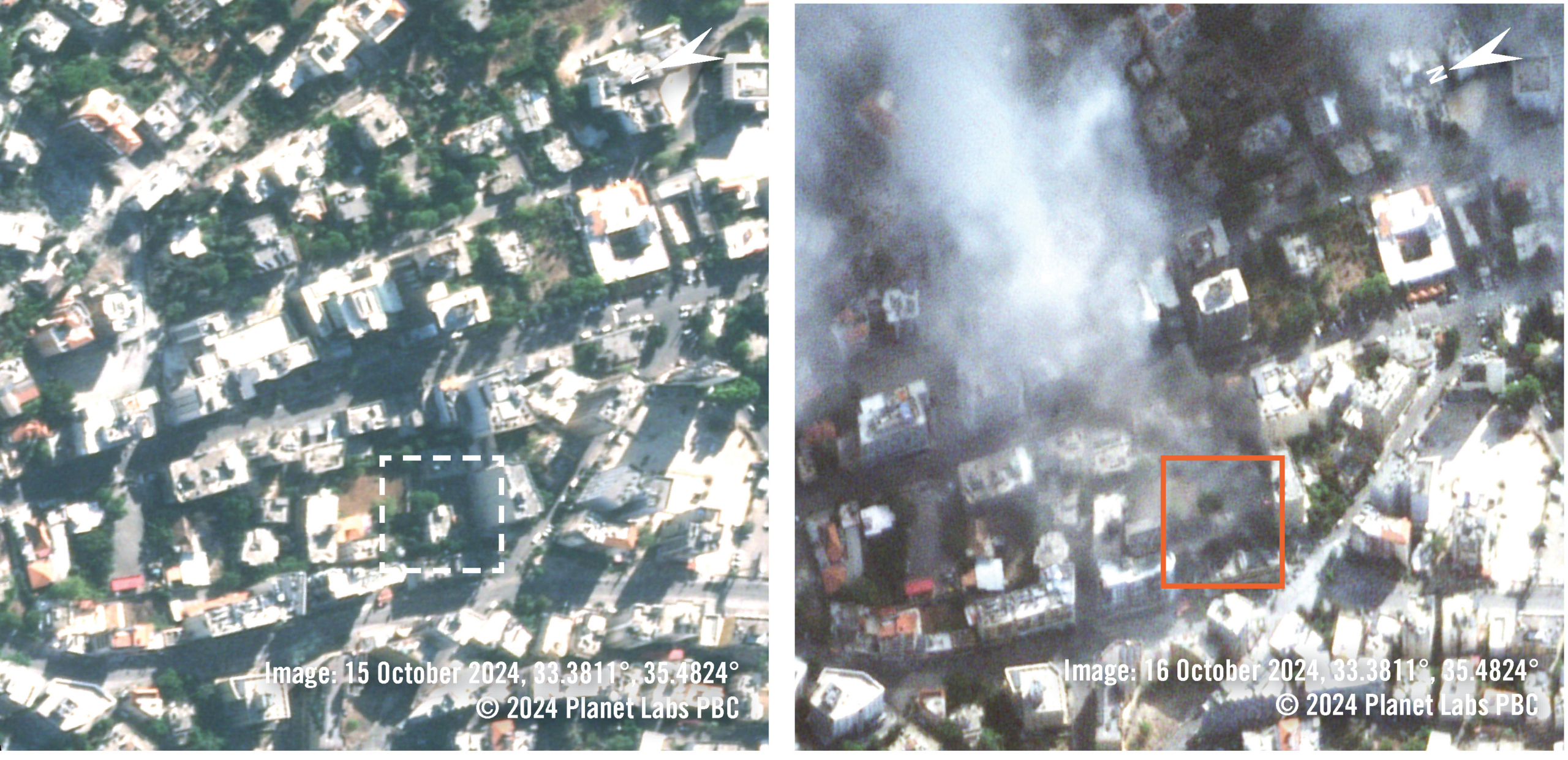 Sur ces images satellite, on peut voir le bâtiment de la municipalité de Nabatiyé le 15 octobre 2024 à 6h28 TU. Le 16 octobre à 7h06 TU, le bâtiment n’est plus visible et un grand panache de fumée s’élève de la zone. L’image semble avoir été prise juste après la frappe aérienne.