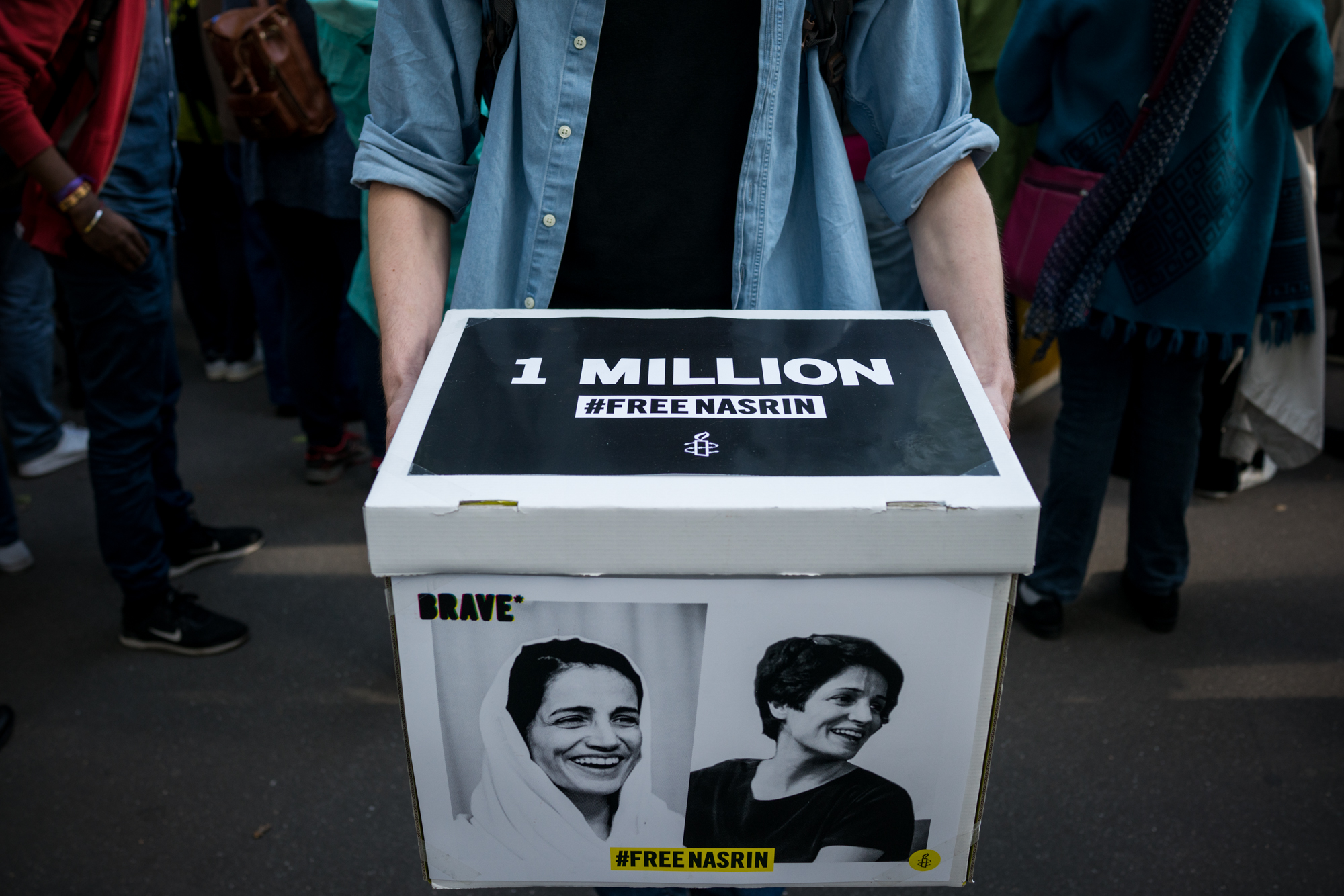 Le 13 juin 2019 marquait le triste anniversaire de l’arrestation de Nasrin en 2018. À cette occasion, nous avons convié de nombreuses associations et tous les citoyens à se joindre à nous pour remettre une pétition de 1,3 million de signatures exigeant sa libération.