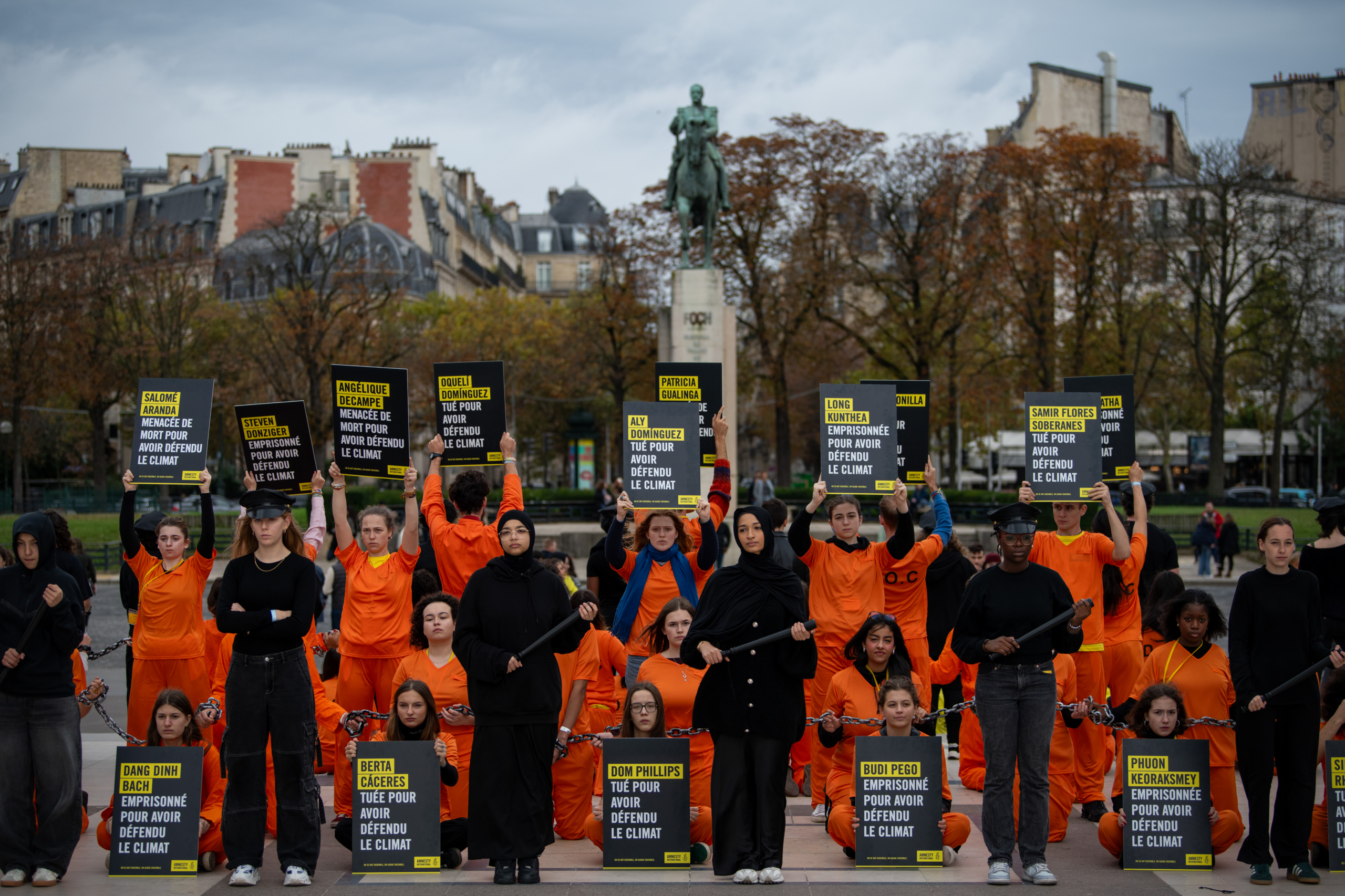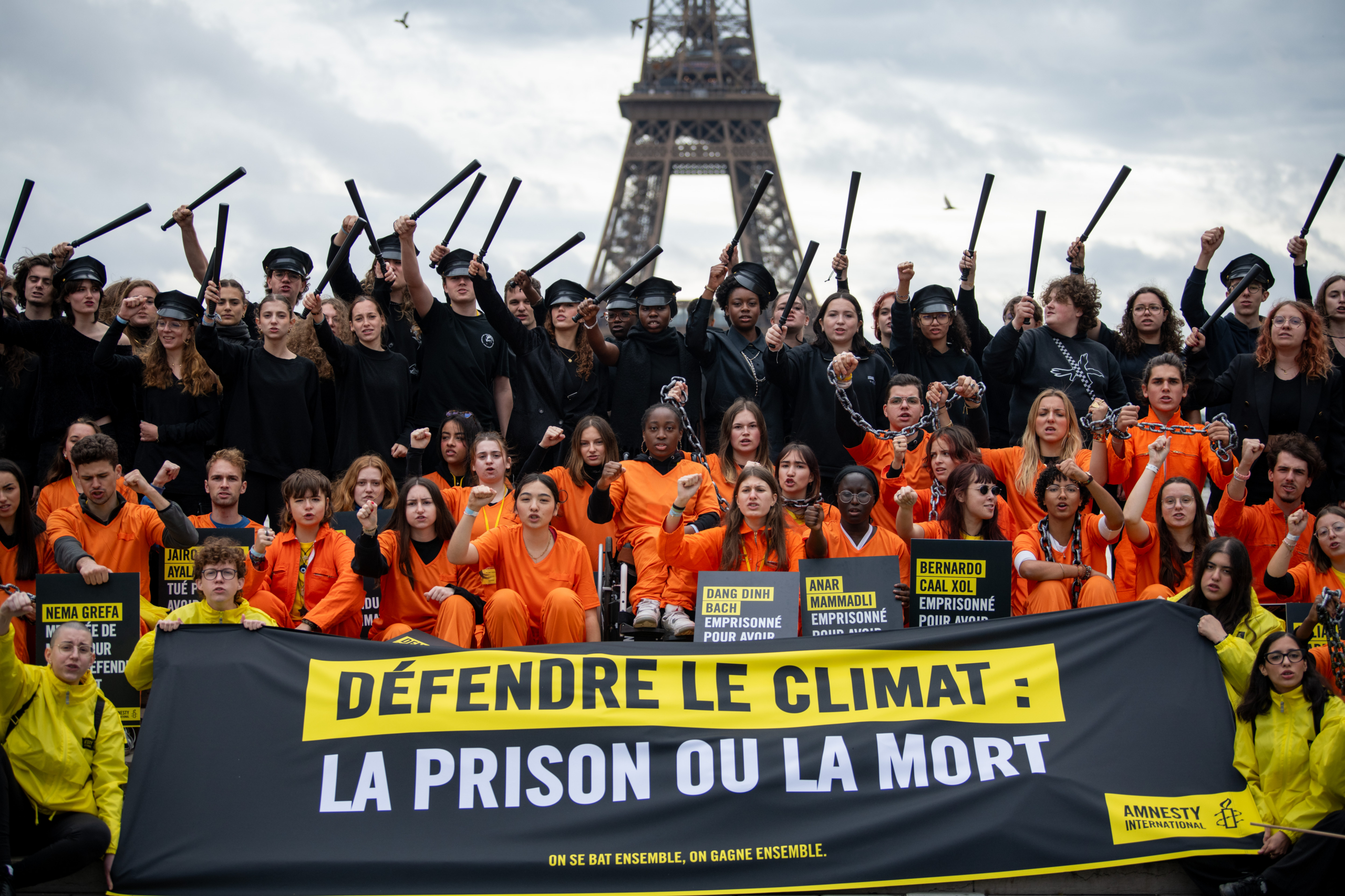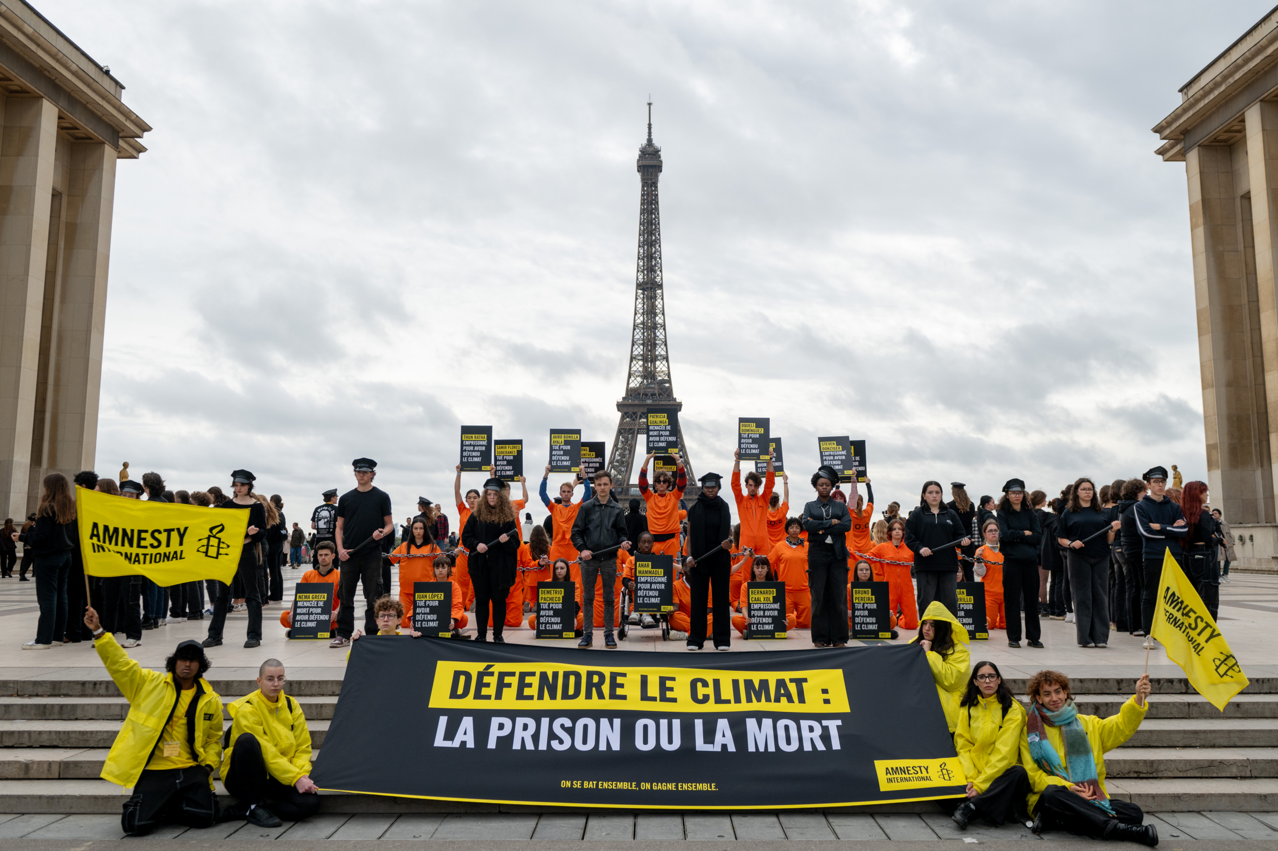 Nos jeunes militant·es lors de l’action en soutien aux défenseur·es de l’environnement. Certains représentaient ces défenseur·es emprisonné·es ou tué·es pour leur combat pacifique et tenaient des pancartes avec leur nom et leur situation. L’autre partie des jeunes les entouraient pour symboliser la répression des États et des entreprises, responsables du harcèlement, de la répression et de la criminalisation de ces personnes. © Benjamin Girette