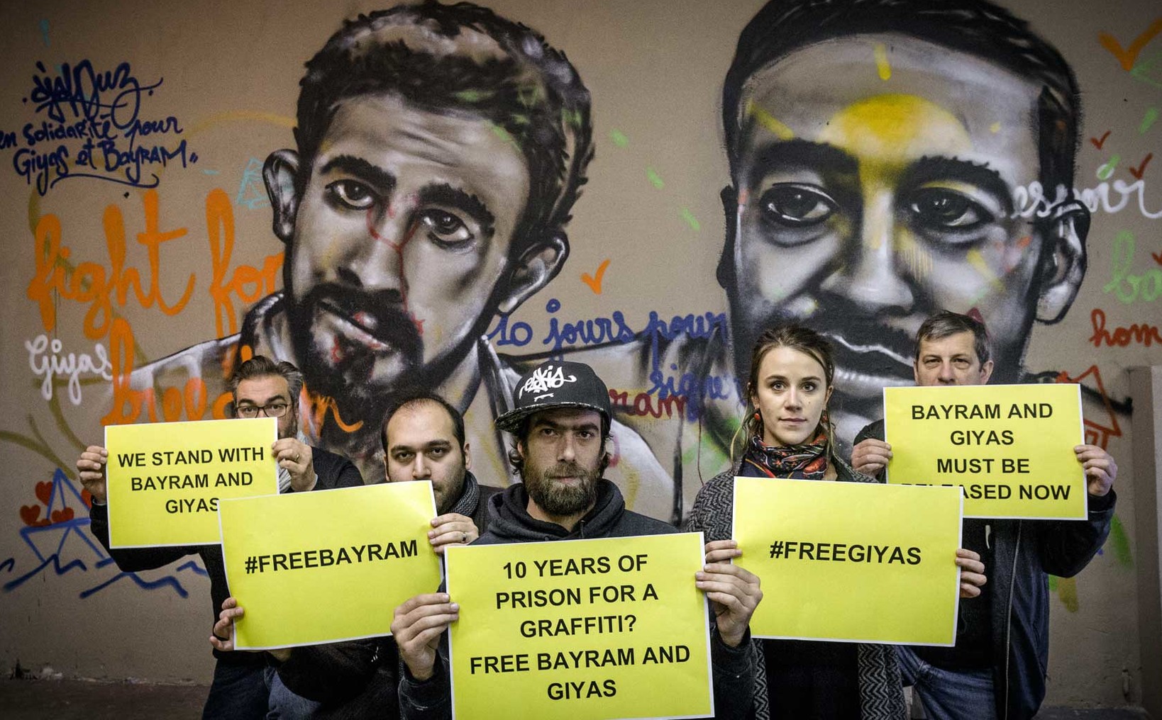 Action de solidarité pour Bayram et Giyas devant le graffiti de Djalouz avec Turgut Gambar, militant pro-démocratie et ami de Bayram © PY Brunaud
