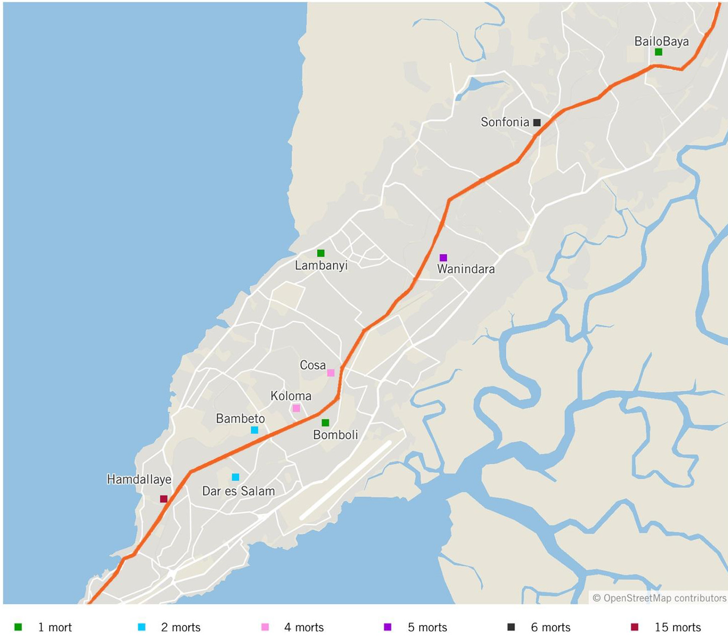 Carte montrant la répartition géographique des cas présumés d’homicides illégaux lors de manifestations à Conakry à la date du 22 avril 2024.