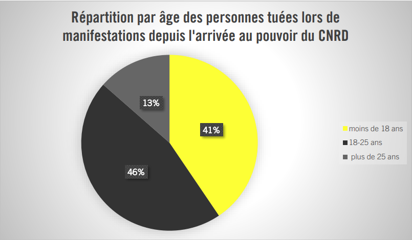 Parmi les personnes tuées ces quatre dernières années, 47 l’ont été après l’arrivée du CNRD au pouvoir, en 2021. Selon nos données, plus de 75 % avaient moins de 25 ans et 40 % étaient des mineurs de moins de 18 ans.