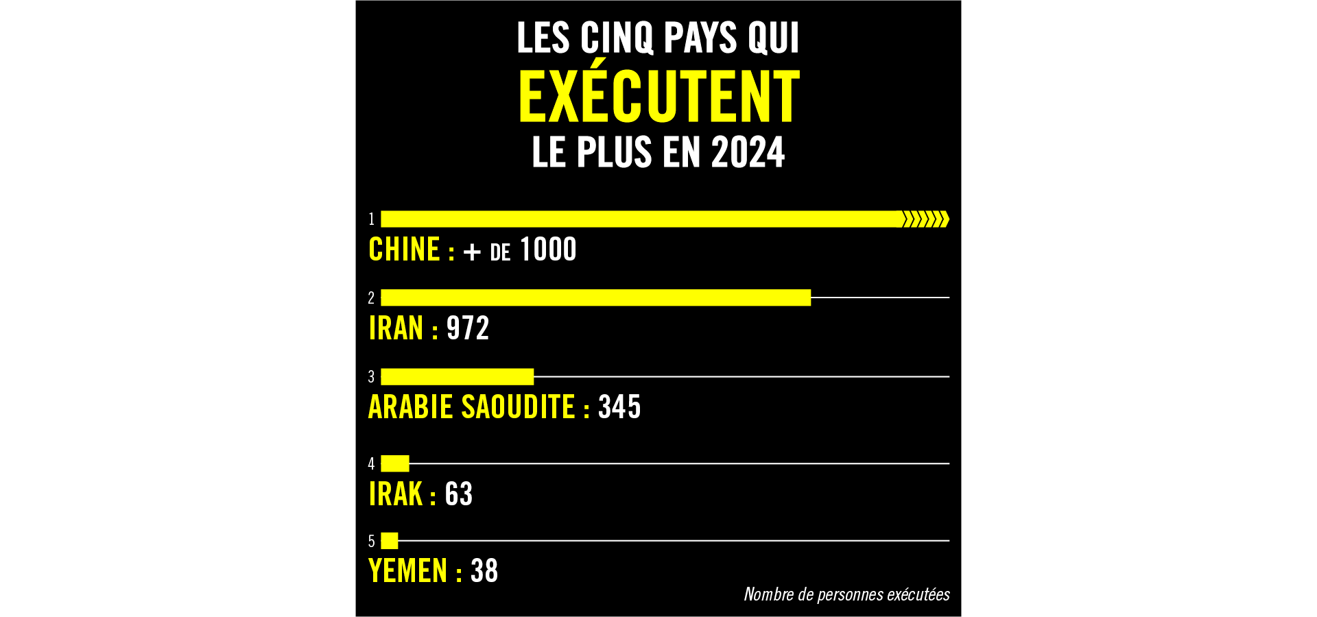 Ces chiffres, en hausse, ne comprennent pas les milliers de personnes très probablement exécutées en Chine, ainsi qu’en Corée du Nord et au Viêt Nam. Ces pays recourent massivement à la peine de mort mais refusent de communiquer le moindre chiffre officiel. Nos équipes n’ont pas non plus été en mesure de vérifier les données pour la Palestine et la Syrie en raison des conflits en cours.