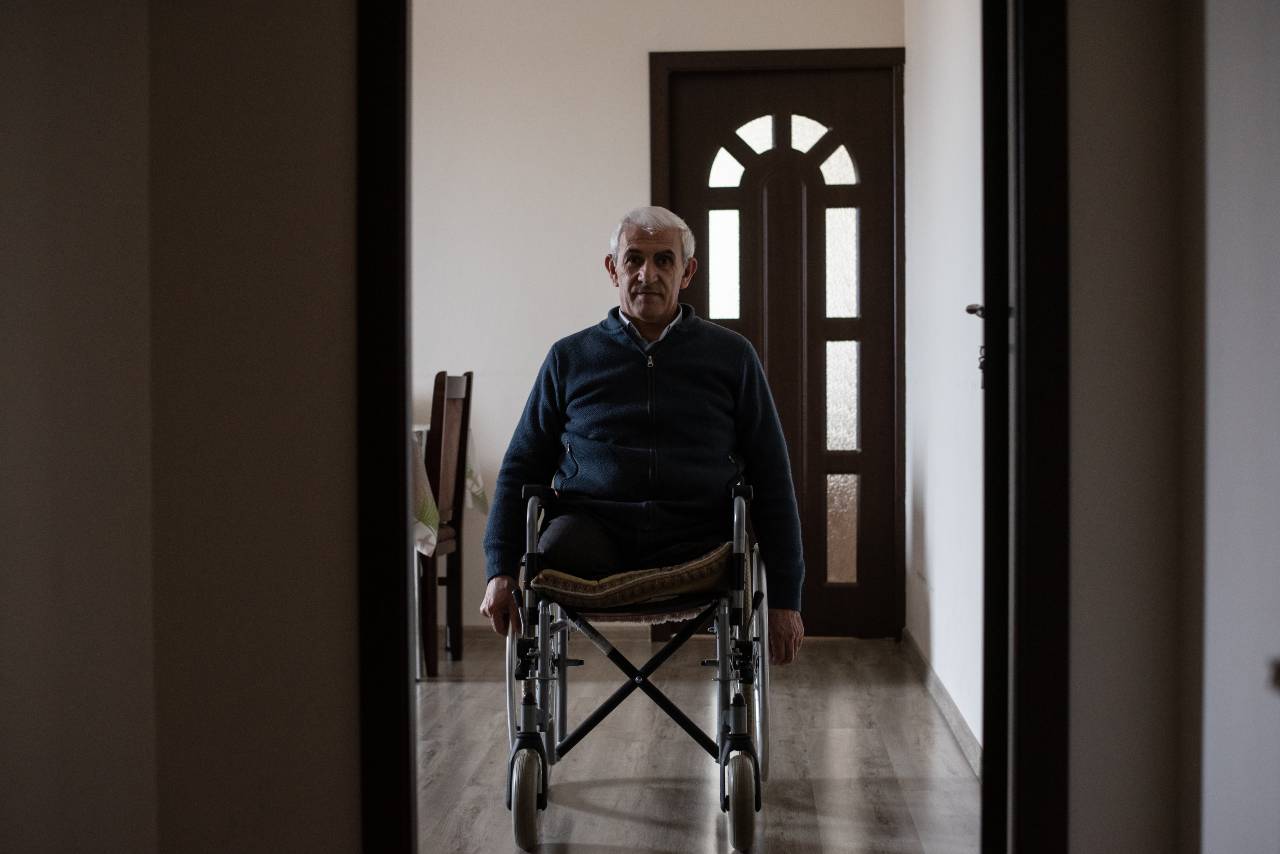 Les personnes porteuses de handicaps, notamment à mobilité réduite, souffrent davantage de l’isolement pendant le blocus, car elles ne peuvent utiliser ni les transports publics ni les transports privés en raison de la pénurie de carburant. Yakov Altunyan, qui se déplace en fauteuil roulant depuis qu’il a été amputé des deux jambes après avoir marché sur une mine dans les années 1990, est de fait bloqué dans son appartement.