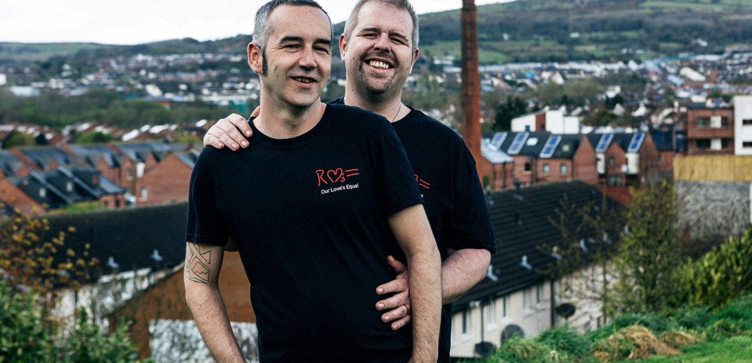 Henry et Chris Flanagan-Kane sont devenus sans le vouloir les symboles de la lutte pour les droits des personnes lesbiennes, gays, bisexuelles, transgenres et intersexes (LGBTI). Ils ont été les deuxièmes à s’embrasser en haut des marches de la mairie de Belfast en 2005, sous les objectifs des appareils photo, pour célébrer l’officialisation de leur « Pacs ».