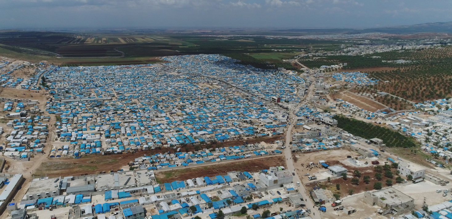 Des personnes déplacées à l’intérieur du pays vivent dans des camps disséminés dans la zone. En 2017, le gouvernement turc a fermé ses frontières, empêchant ainsi des personnes venant d’Idlib ou d’ailleurs de chercher refuge en Turquie. Par conséquent, plusieurs camps ont été installés dans le nord de la ville, près de la frontière. Ceux-ci accueillent aujourd’hui le plus grand nombre de personnes déplacées qui fuient la violence à travers la Syrie.