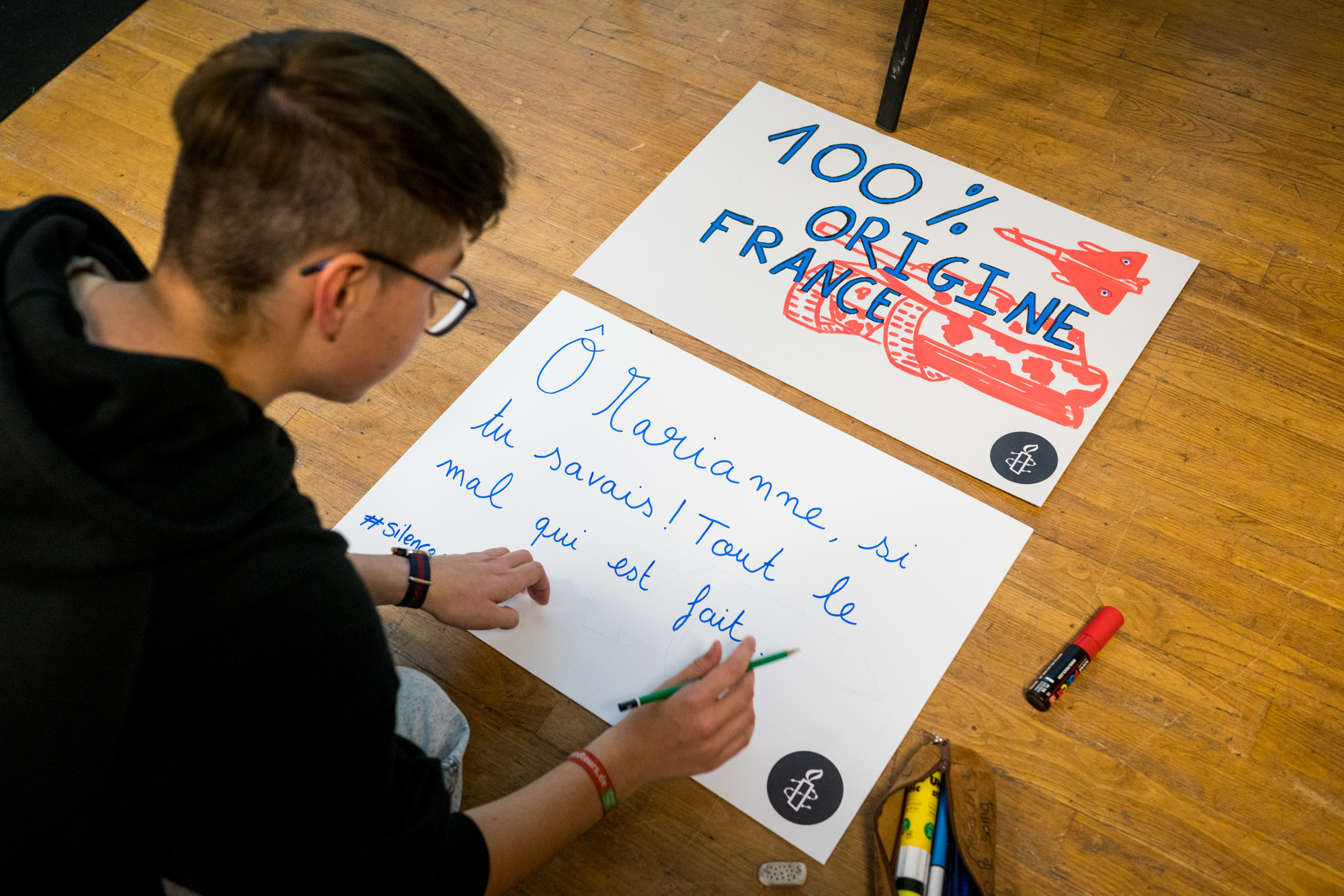 Le lendemain, nos jeunes militants ont préparé une action pour dénoncer les ventes irresponsables d’armes de la France. Pancartes créatives, affichage sauvage, clean tag, … nous leur avons donné les moyens d’agir.