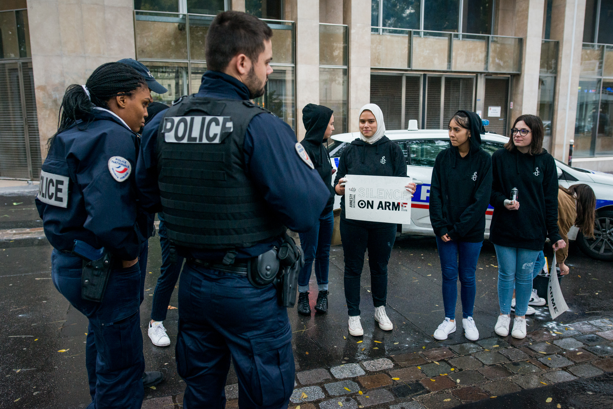 Atelier clean tag sur la campagne « Silence on arme ! » à Belleville © Benjamin Girette