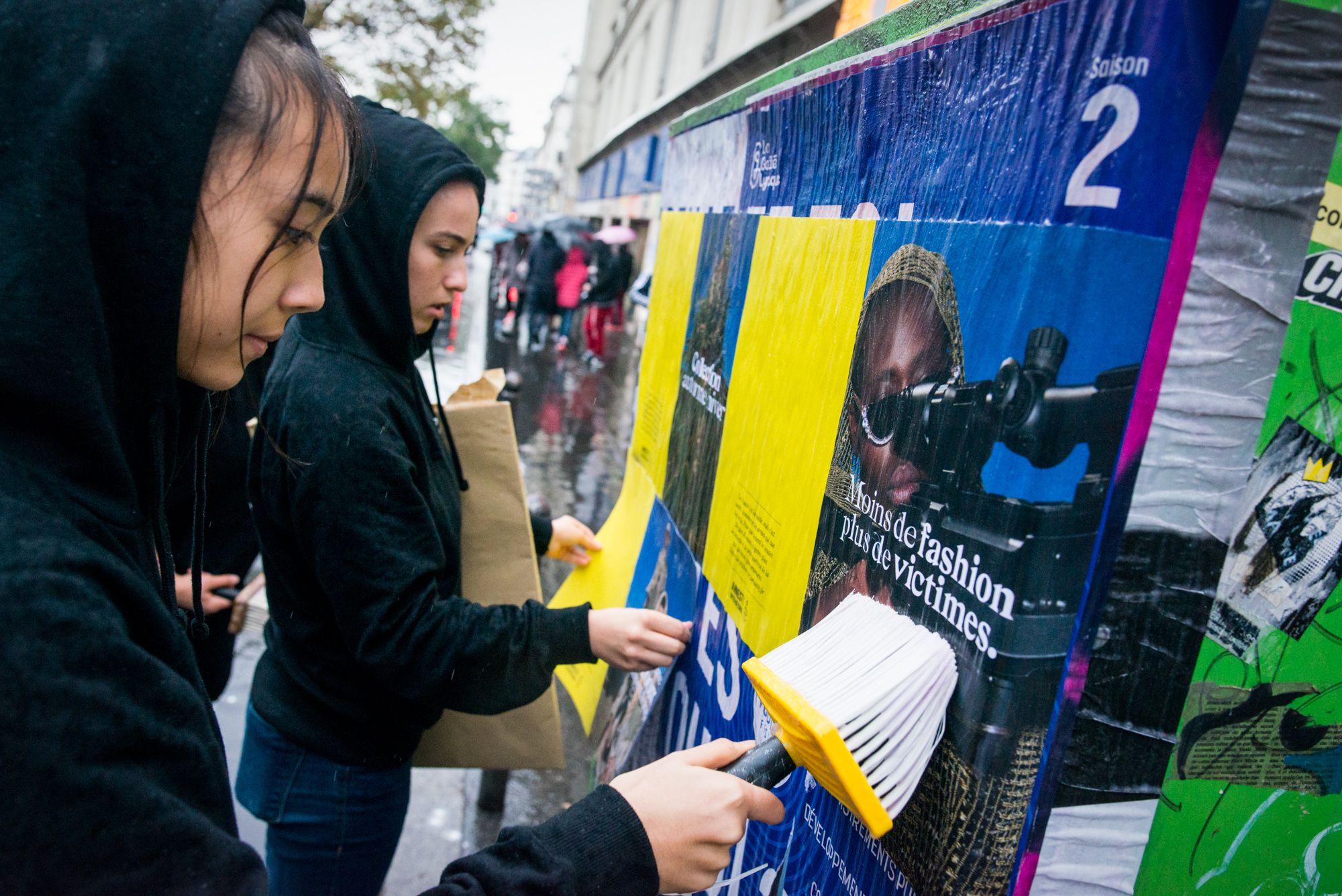 Atelier affichage sauvage sur la campagne « Silence on arme ! » à Belleville © Benjamin Girette