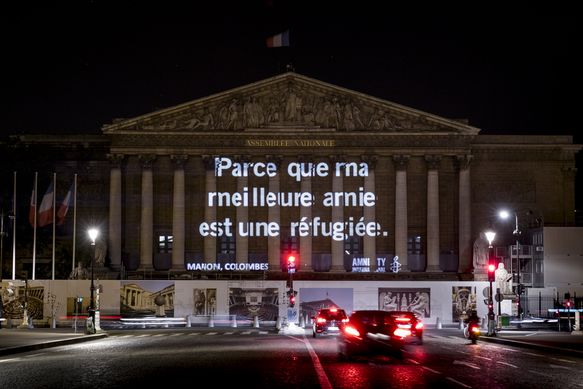 La veille de cette action, Amnesty International a projeté les messages des citoyens pour l’accueil des réfugiés © Pierre-Yves Brunaud / Amnesty International France