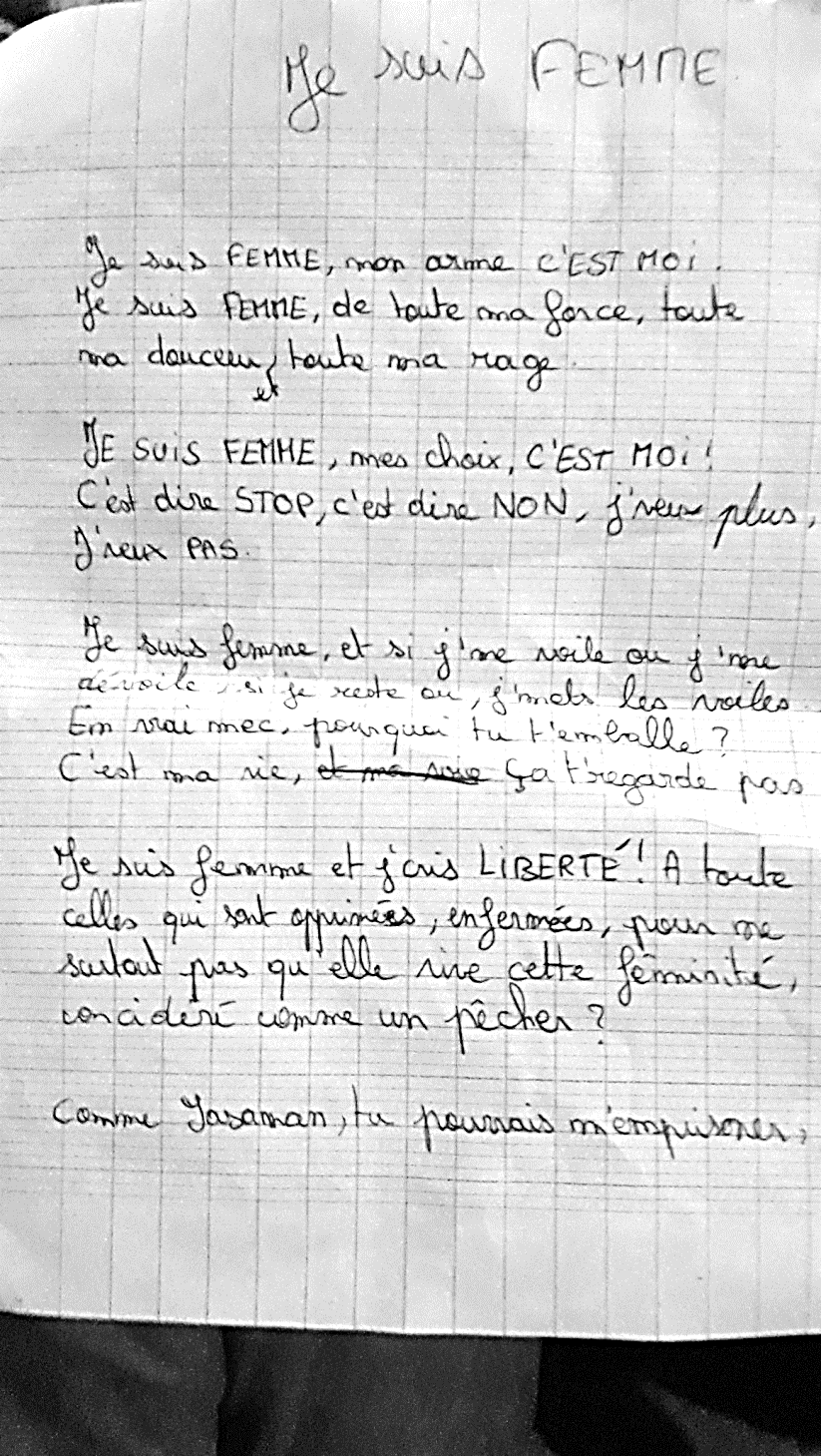 A la veille du démarrage de notre opération des 10 jours pour signer, Bilal, micro en main, a tenu à partager l’histoire de l’iranienne Yasaman Ariani, condamnée à seize ans de prison pour avoir ôté son voile en public dans le métro de Téhéran : « Elle s’appelle Ariani / Désire une fleur de paix au pays / Courageuse aux égards qui nous semblent inconnus / Outre-passeuse de normes d’un diktat patriarcal / Vouloir le choix individuel de pouvoir se mettre à nue / Voyageuse avec une cellule comme prochaine escale ».