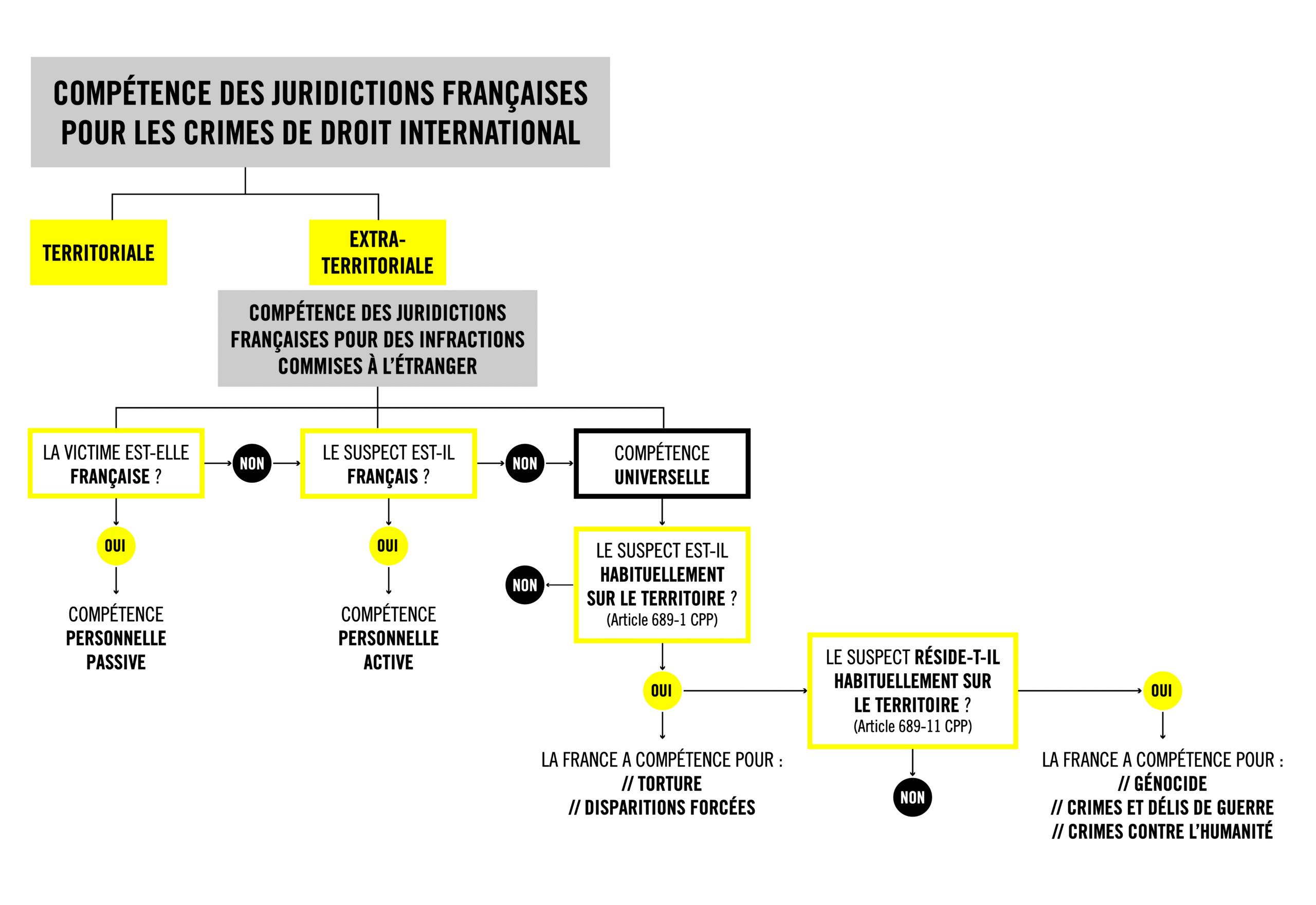 - Le retrait de l’exigence de résidence habituelle sur le territoire français de l’auteur des faits, alors que pour tous les autres crimes internationaux la simple présence suffit (voir art. 689-1 à 689-10 du CPP) (verrou 1)